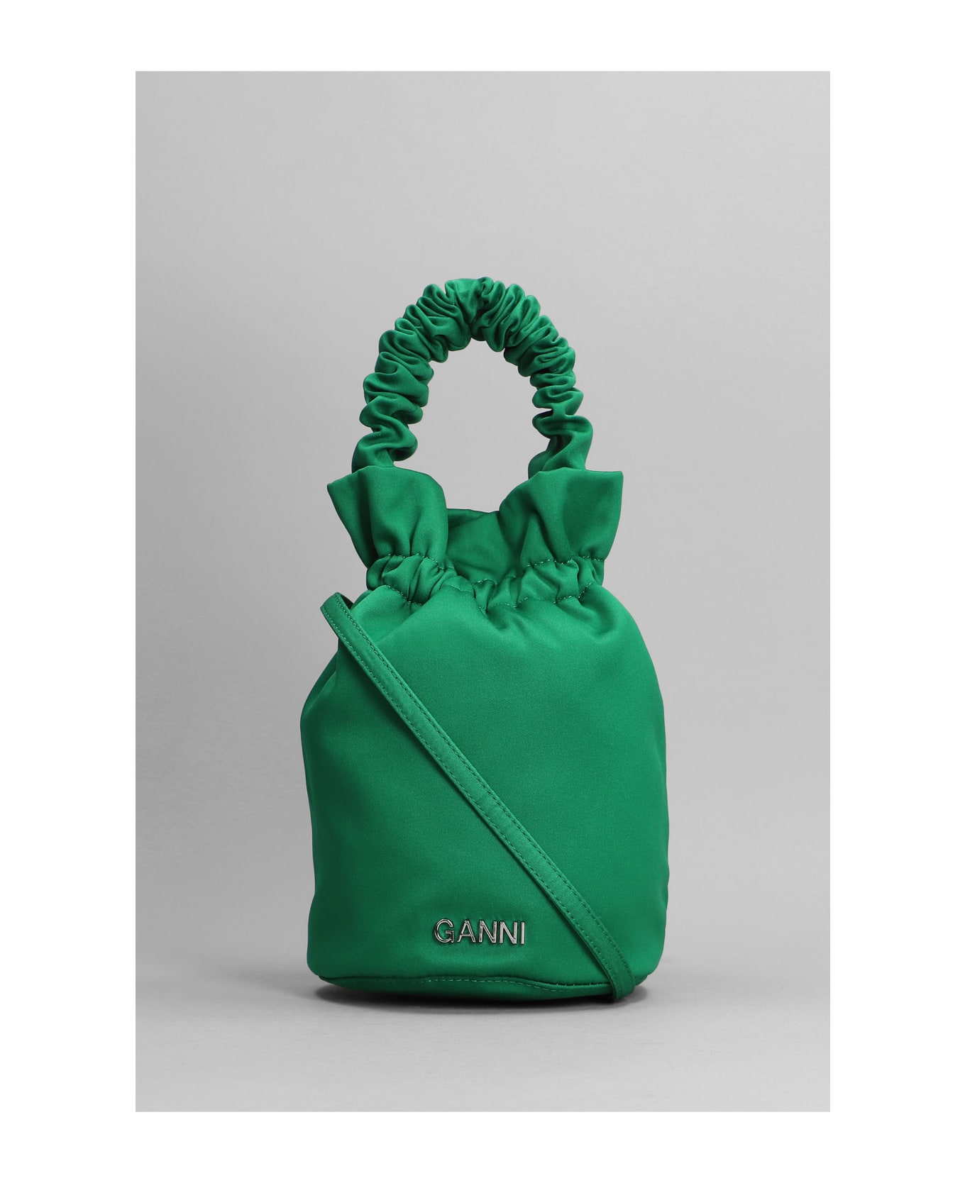Hand bag in green polyester, handle, shoulder strap, gathered detailing, front logo, Made in China, Height 200 mm, Width 180 mm Composition: |