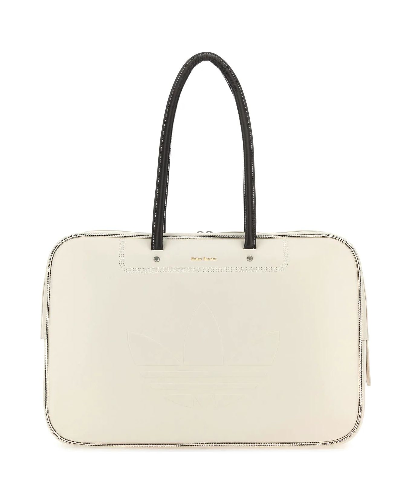 Travel bag realized in collaboration with Adidas realized in slightly pebble leather characterized by laminated printed logo at the front and at the back and logo in relief at the front.