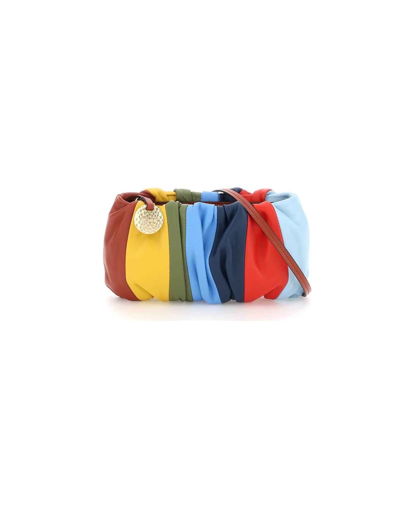 Riviera Bean bag by Staud in gathered multicoloured nappa leather with removable leather handle. Zip closure featuring leather zip puller with hammered metal medallion with engraved logo. Suede lining and one inner small patch pocket with leather logo tag. Gold-finished metalware.