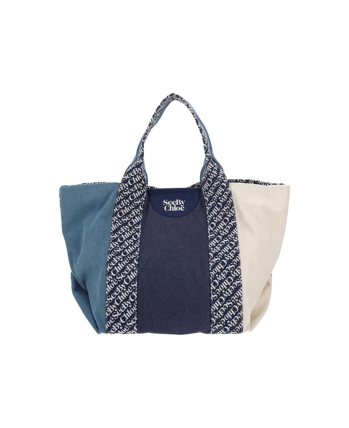 Cotton Letizia Bag by See by Chloé, two short handles, denim design on the front, iconic all-over repeated brand logo on the back, magnetic button closure inside, internal welt pocket, contrasting branded leather patch on the front.