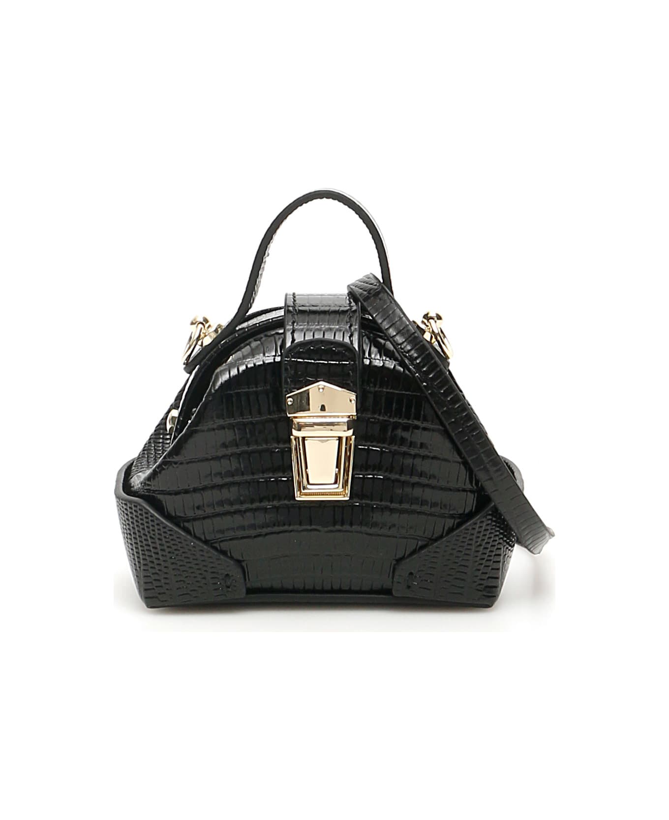 Manu Atelier Micro Demi semi-circular bag in lizard embossed leather with single handle, removable leather shoulder strap, hinged frame with foldover strap and press lock closure. Gold-tone logo print on the back, decorative leather corners at the base. Jacquard fabric lining, gold-tone metal parts.