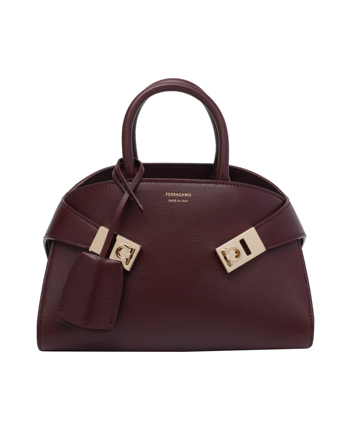 Ferragamo plum Mini Hug handbag, 2 inner slots, 2 handles, adaptable and removable strap, frontal mini logo Composition: 100% Calf Leather