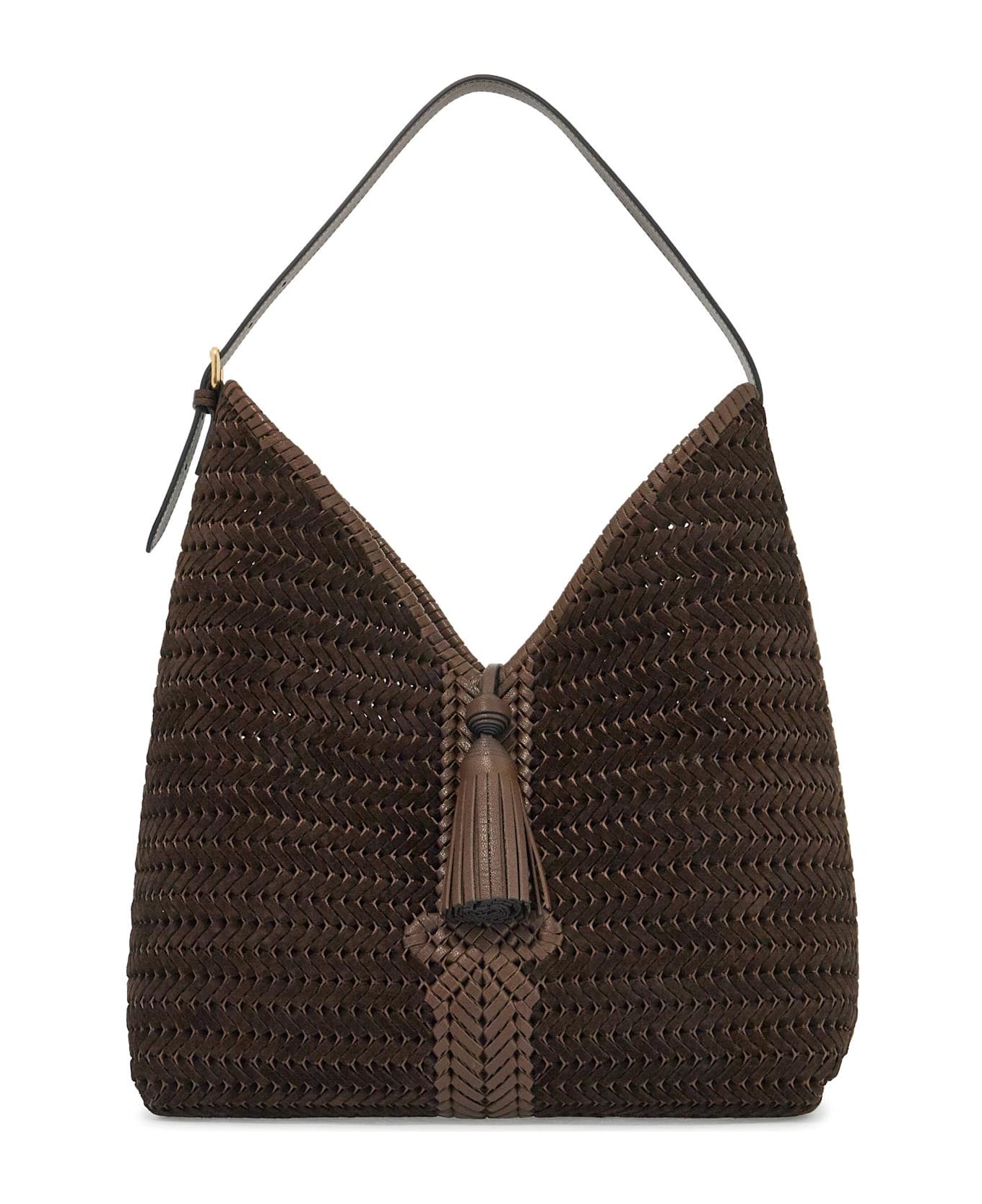 Neeson Tassel hobo bag by Anya Hindmarch made of woven suede with maxi smooth leather tassel. Magnetic closure, unlined interior with one open pocket and adjustable handle.