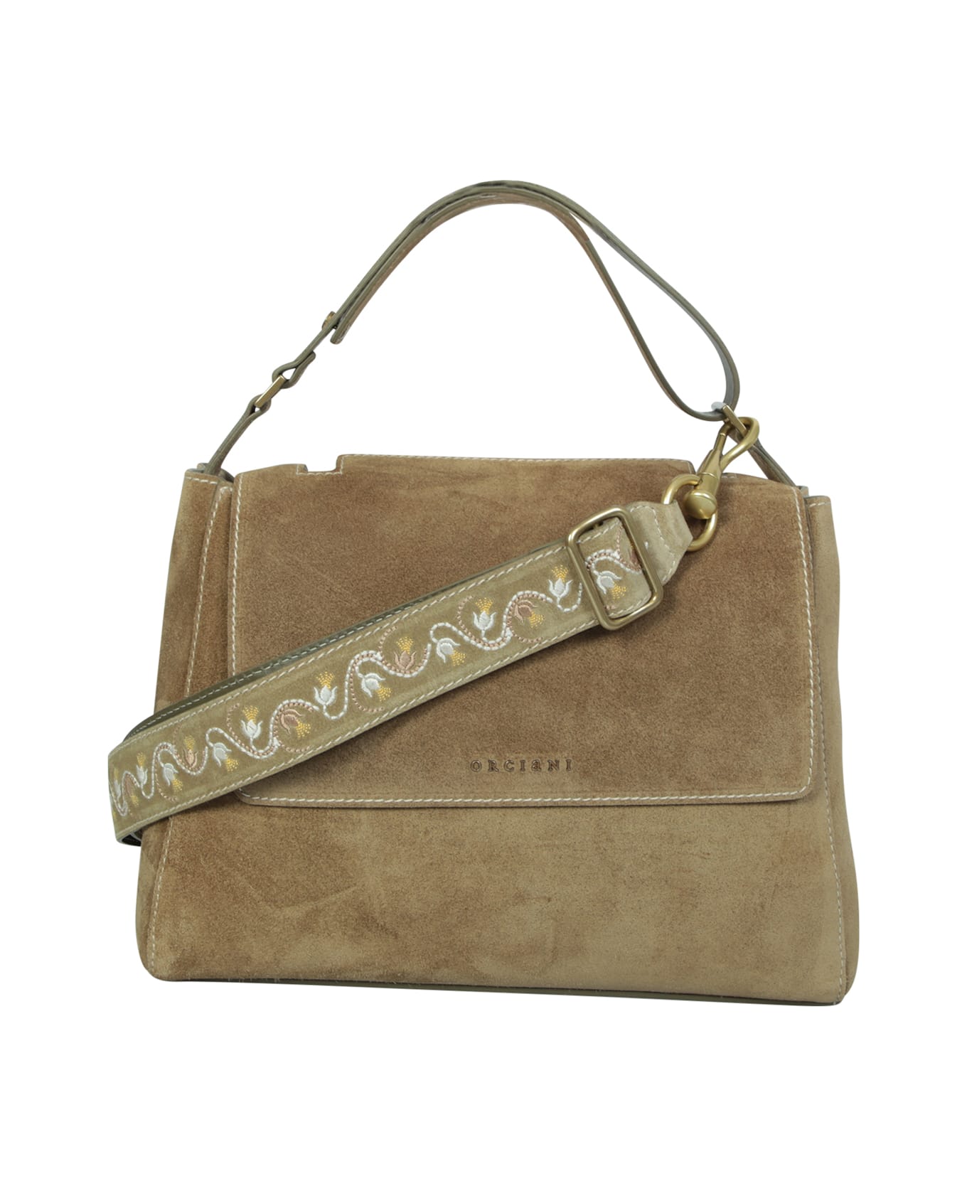Foldover top. Magnetic fastening. Main compartment. Internal zip fastening pocket. Logo patch inside. Front logo. Single top handle. Embroidered shoulder strap. Adjustable detachable shoulder strap. Gold tone hardware. Suede. Color: green tobacco