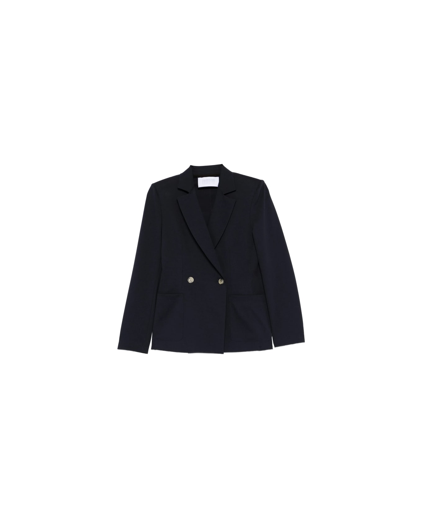 navy blue double-breasted front flap pockets notched lapels button fastening long sleeves