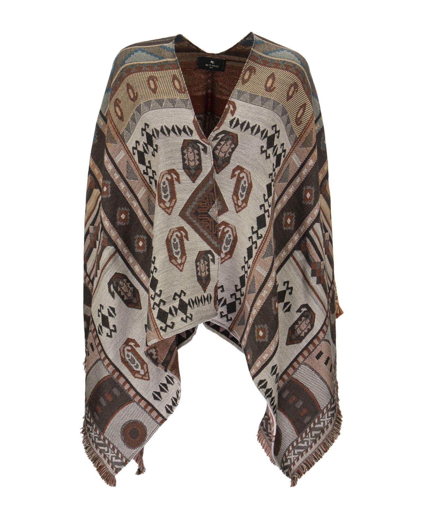 Wool and cotton jacquard cape, decorated with a geometric design and Paisley motifs is embellished with fringes. DESIGNER ID: 15214 9409 800 Composition: 82% Wool 9% Modal 9% Cotton