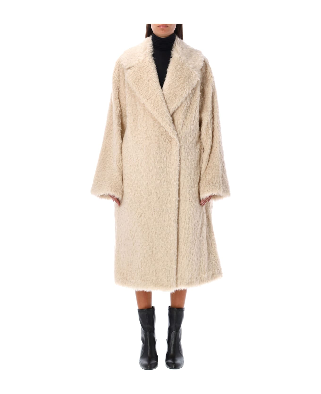 Nicole Faux-fur Coat By Stand. Featuring: V-neck Long Sleeves Drop Shoulders Snap Button Closure At Front Lateral Pockets Inner Pocket Flared Line Oversize Fit Faux Fur Model Is 1,72 M Tall And She Is Wearing Size 36
