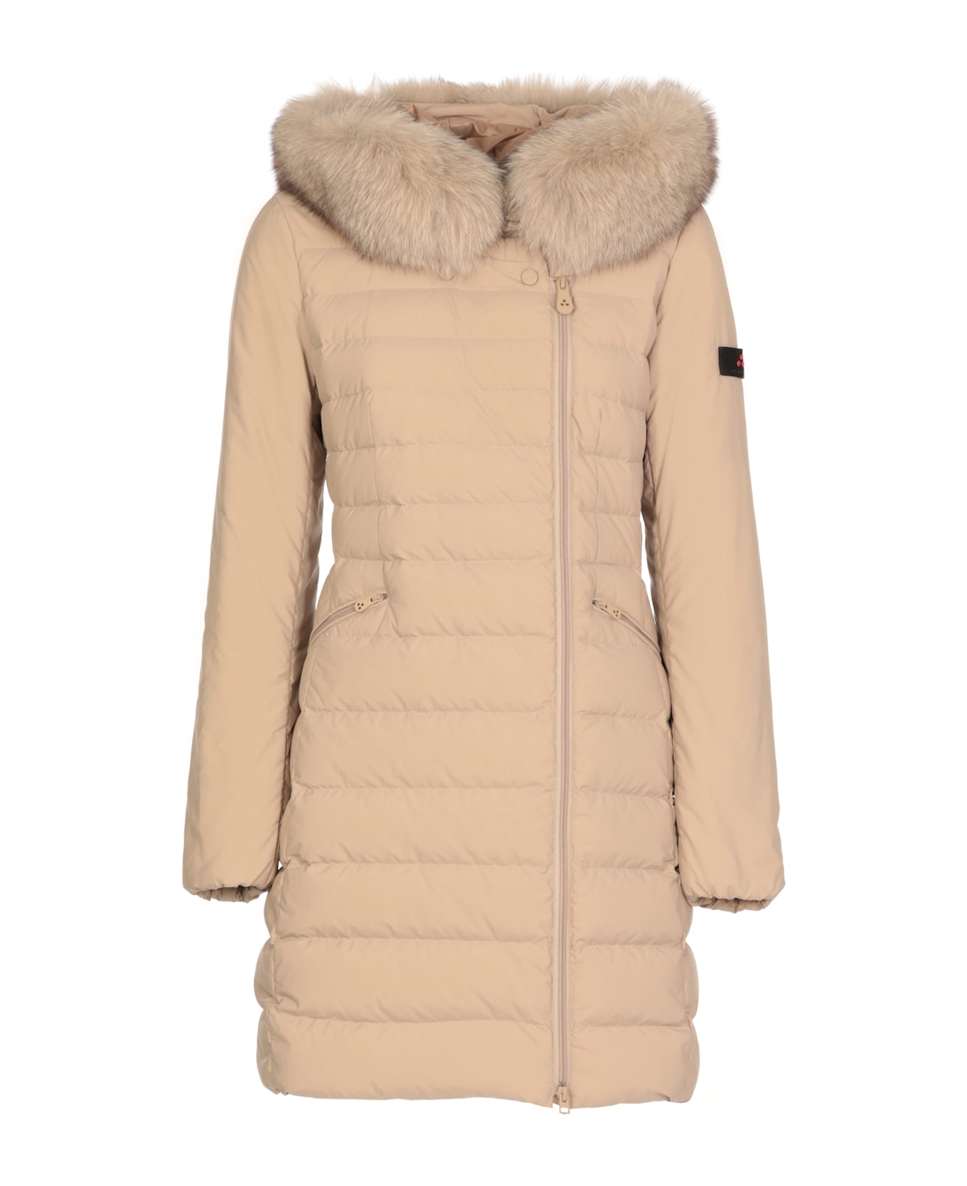- Beige Peuterey padded and quilted down jacket for woman - High neck with snap buttons - Hood with removable fur detail - Long sleeves with elastic at cuffs - Front zip fastening - Two front zip pockets - Contrasting color gros grain logoed tab at left sleeve