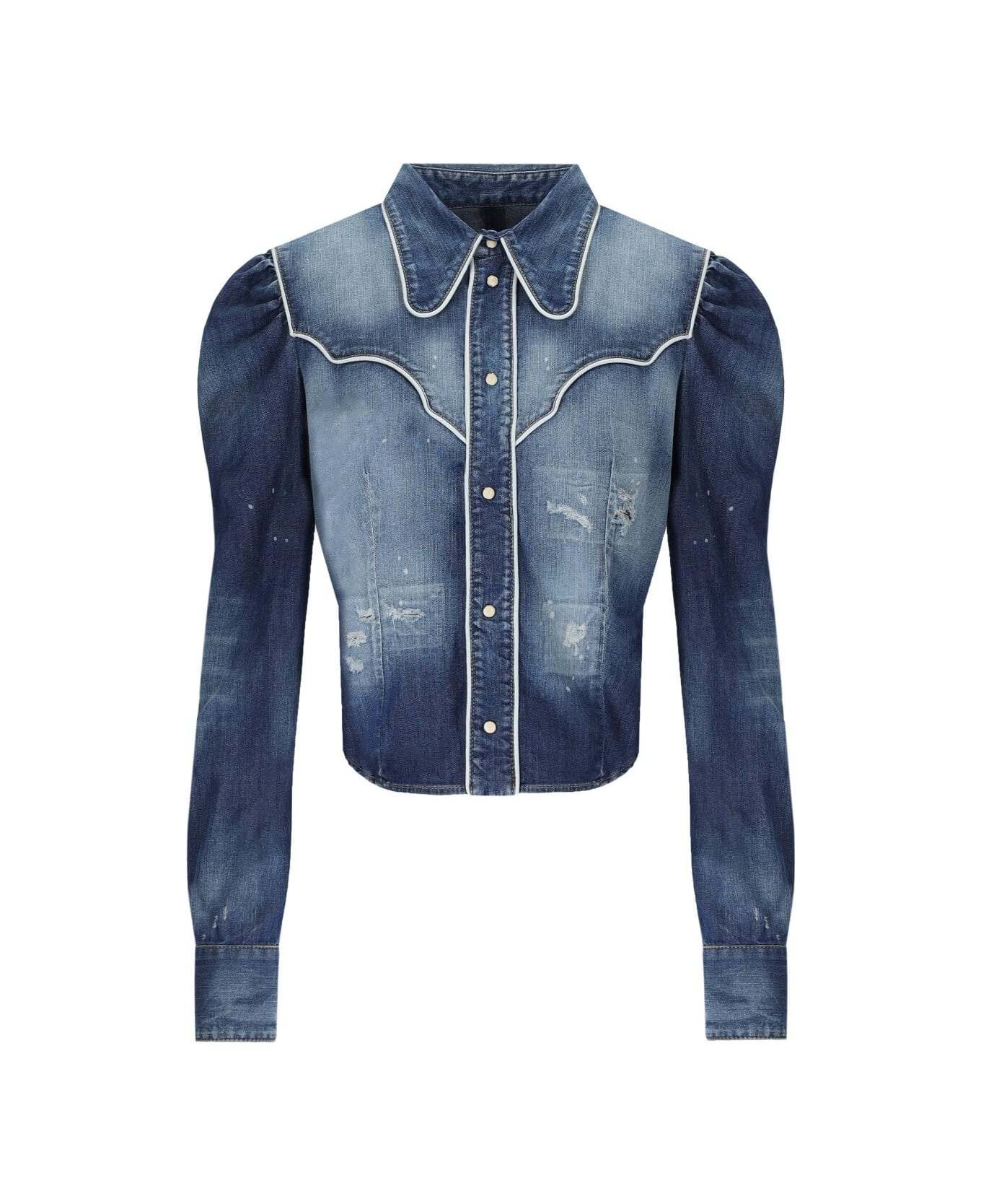 Dsquared2 crop shirt made of medium blue cotton with rips and washed-out effect details. Contrasting piping, slightly puffed shoulders and button closure. Composition: 98% cotton, 2% elastane.