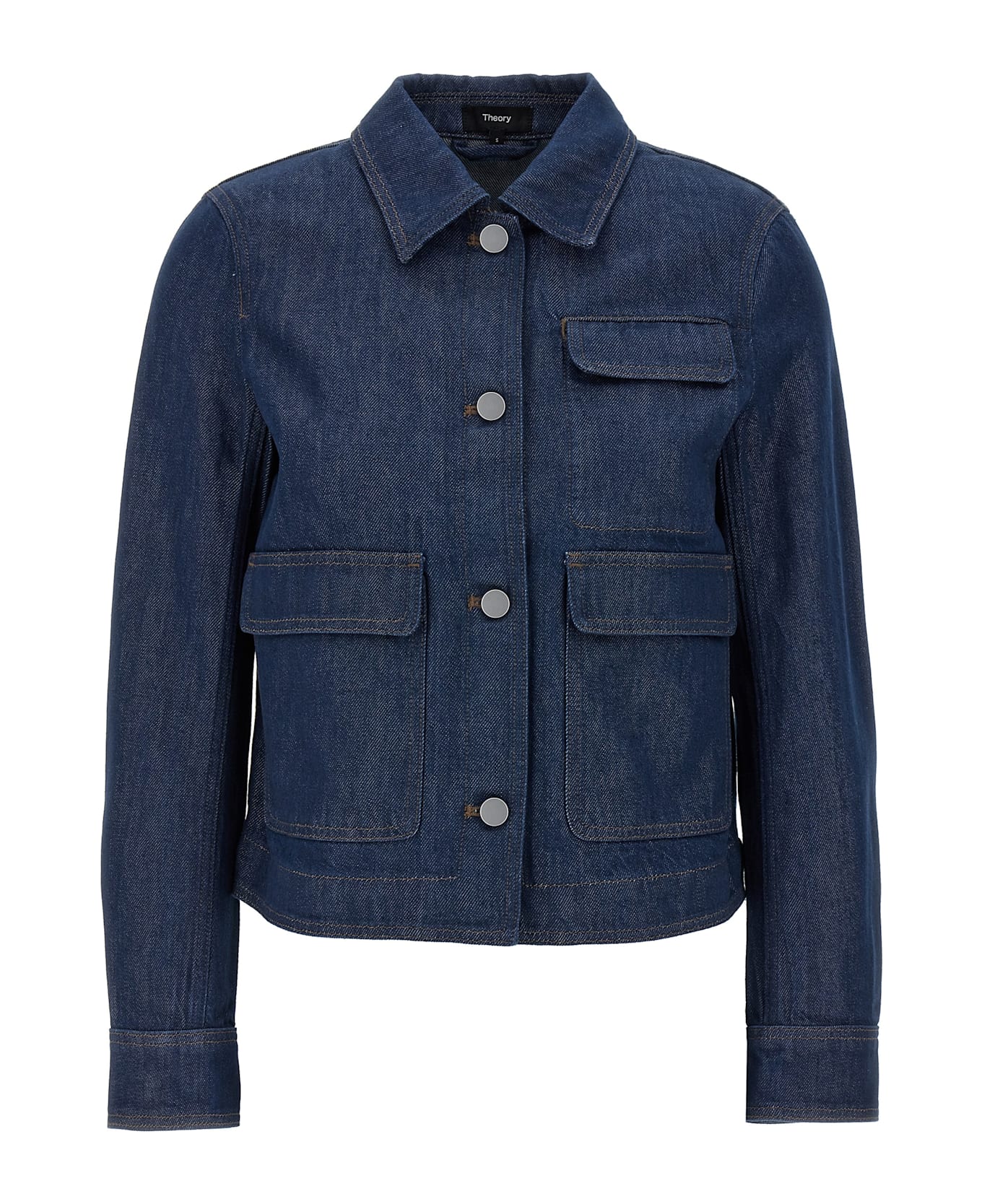 Denim jacket with button closure, front pockets, flap closure.