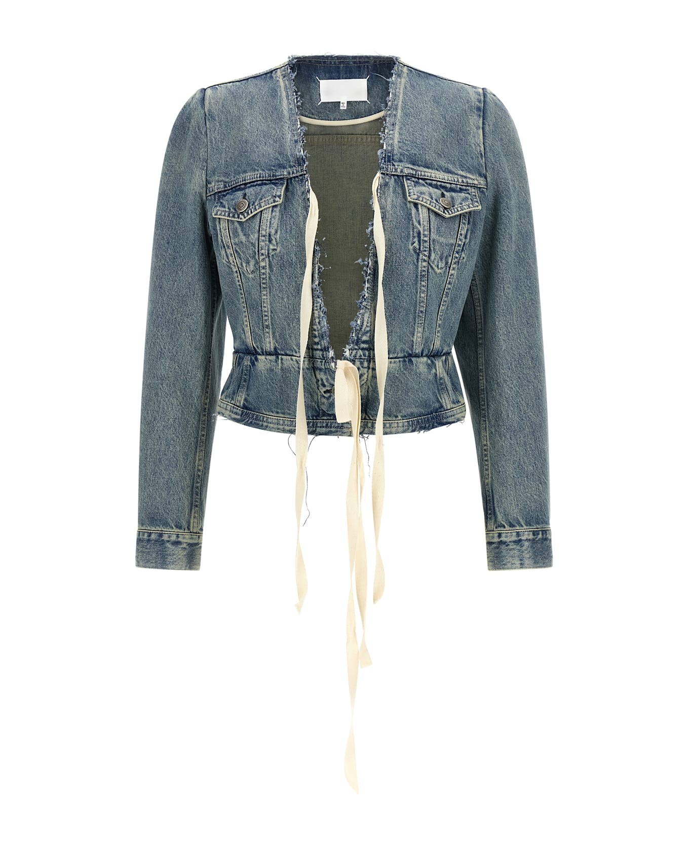 Stone-washed cotton denim jacket, crop model, V-neck with raw cut hem and contrast grosgrain ribbons to tie as desired, front metal button closure, long sleeves with cuffs, 'Four Stitches' at the back.