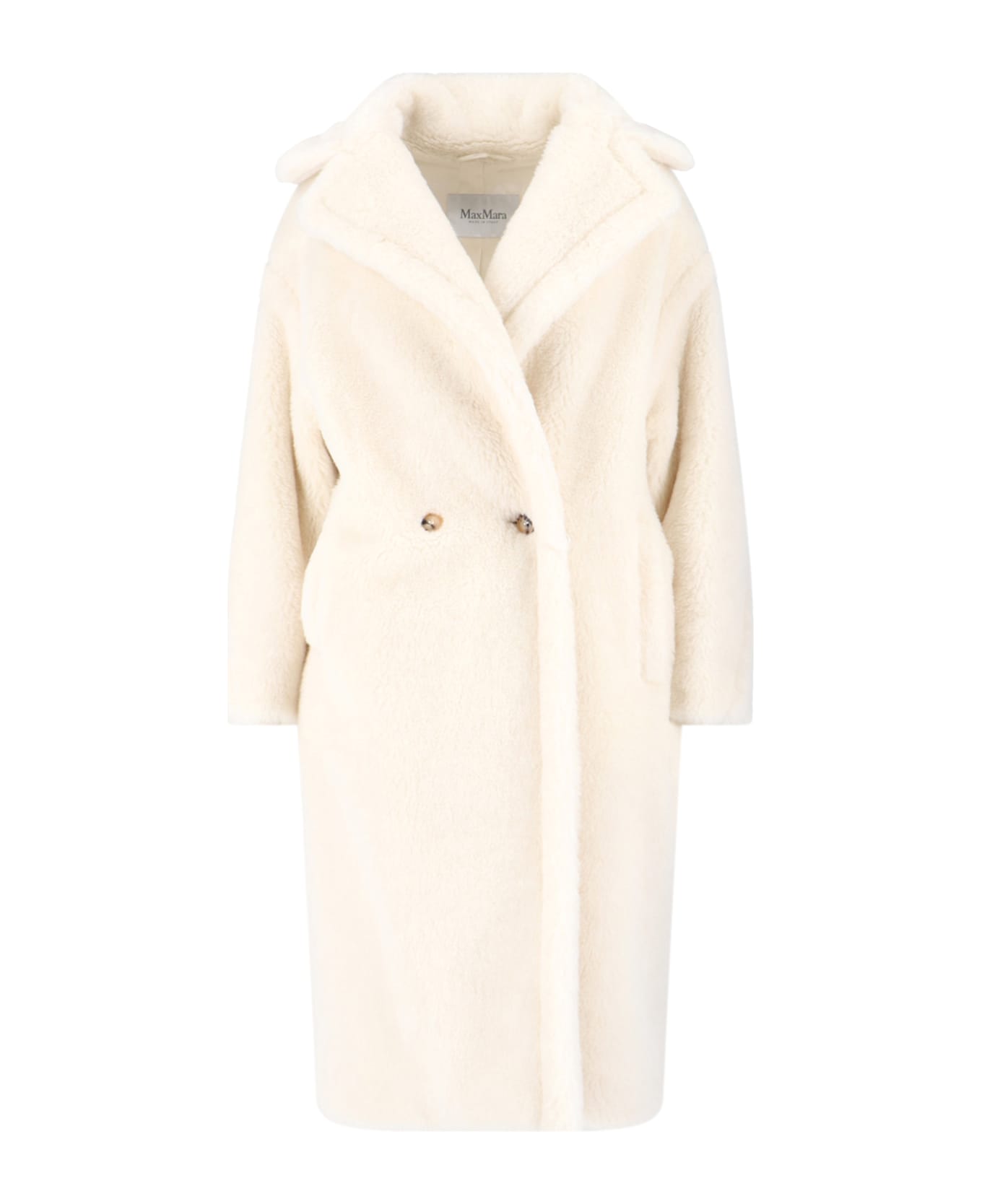 Max Mara Teddy bear coat in white alpaca blend with faux fur effect, collar, dropped shoulders, horn button closure, two side pockets, and straight hem. Composition: 62% Alpaca, 26% Virgin Wool, 12% Silk