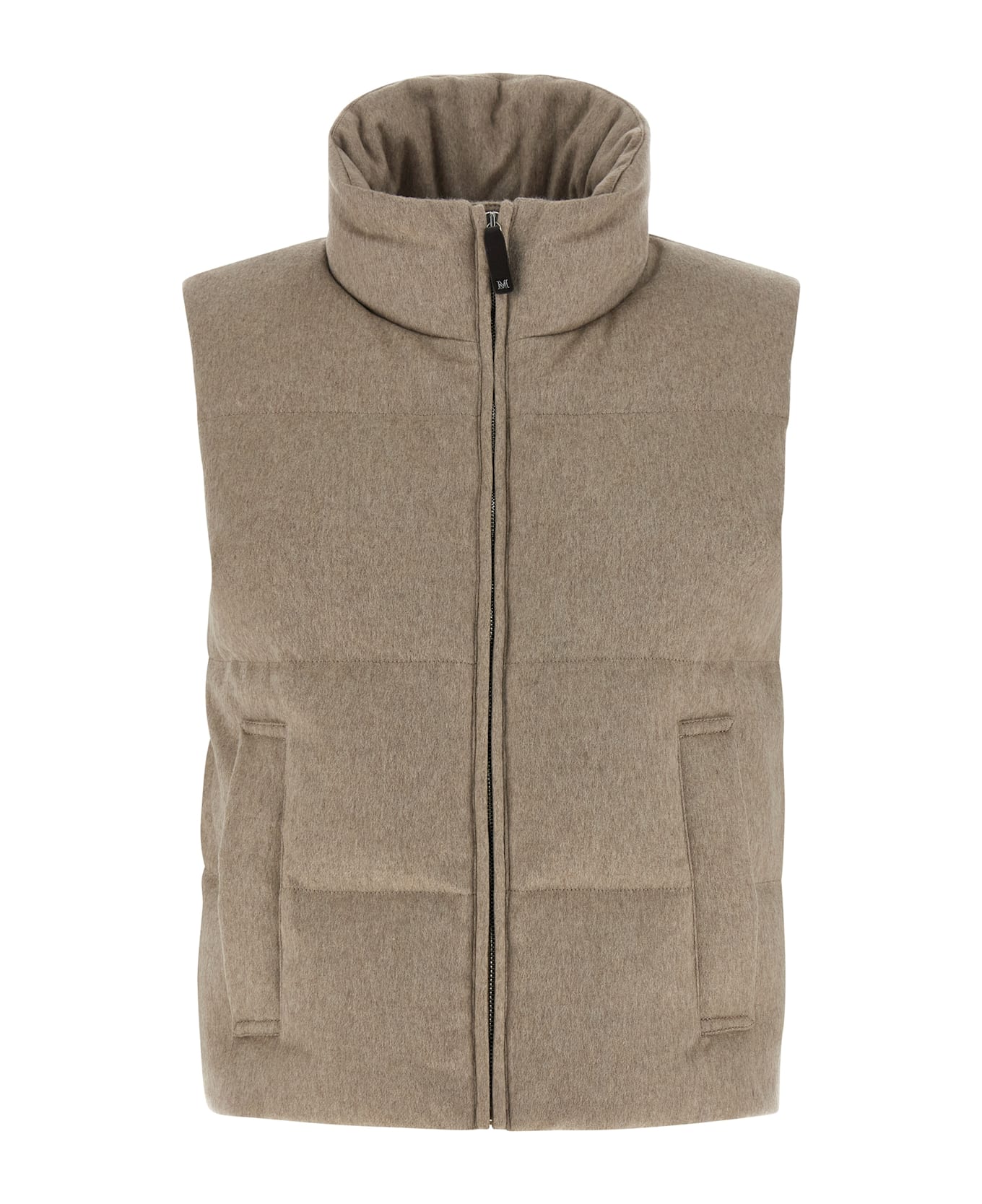'MtcAmoroso' vest in pure cashmere drap quilted with horizontal stripes and goose feather padding, iridescent waterproof canvas lining, tone-on-tone logo embroidery at the back, standing collar, front zip closure, pockets.