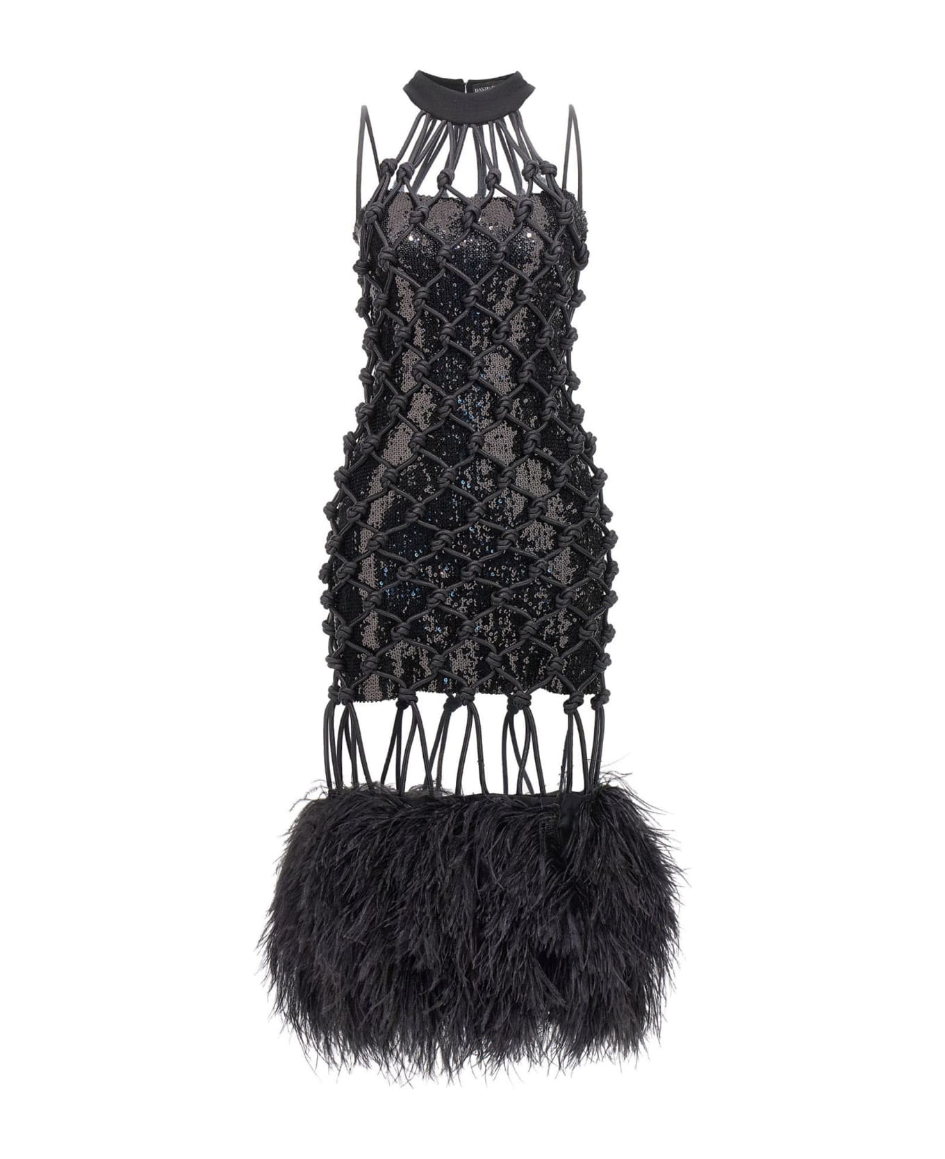 Abito 'Fish Net Layer Feather Hem Sequin' composto da due pezzi, un abito con spalline sottili e applicazione paillettes all-over e un abito in corda annodara stretch con colletto e fondo con piuma applicate.