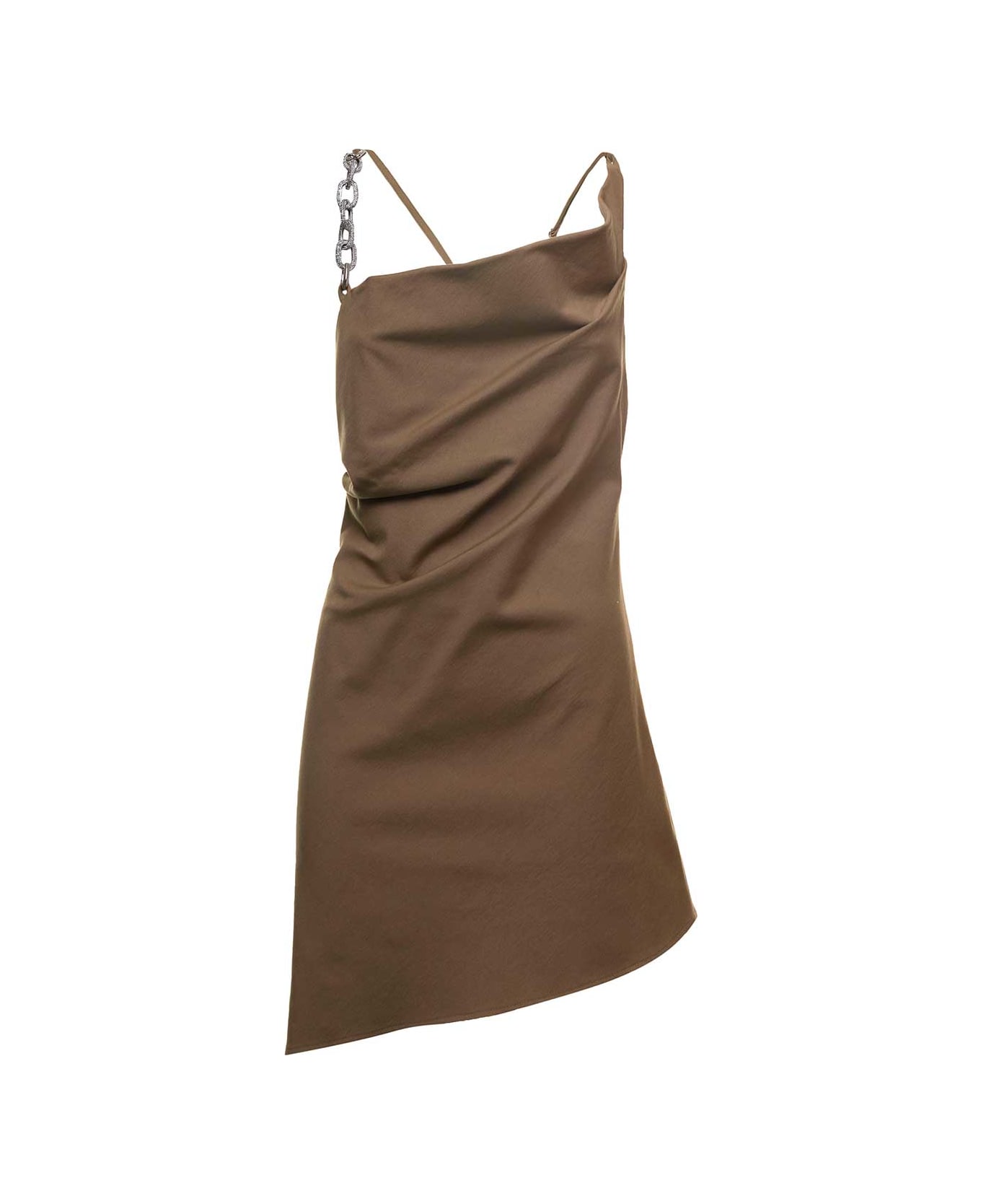 Dress Oblique neckline Beige Jersey Thin crisscross straps Chain detail on the shoulder strap Asymmetrical bottom