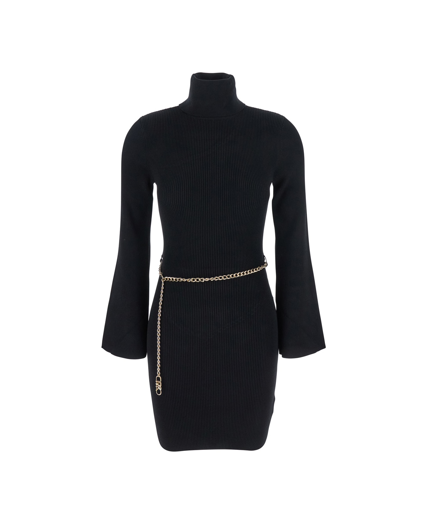 Mini dress Black High neck Long flared sleeves Chain belt Logo plaque on the rear Gold tone metalware Straight hem Ribbed knit Viscose blend stretch Regular fit