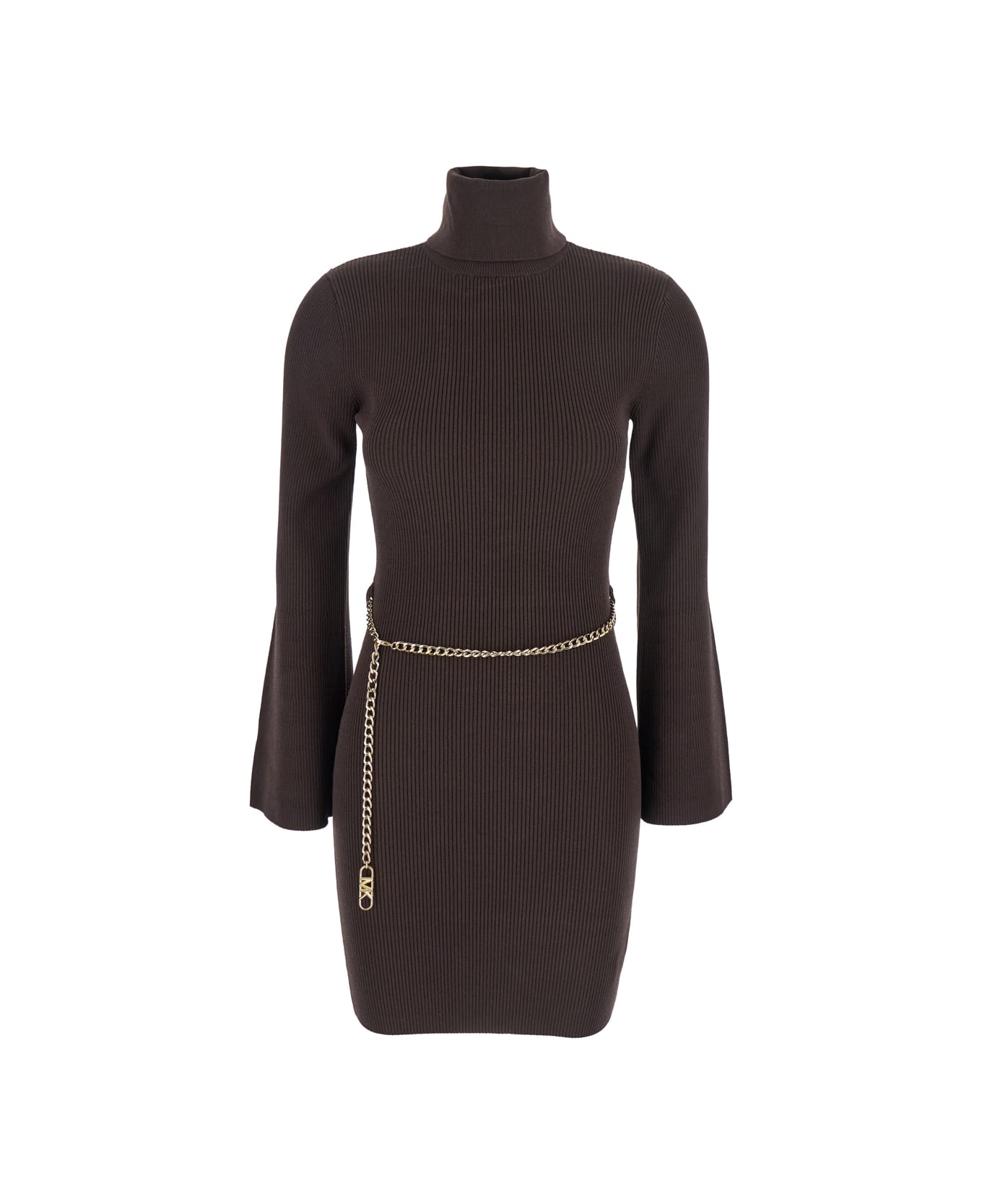 Mini dress Brown High neck Long flared sleeves Chain belt Logo plaque on the rear Gold tone metalware Straight hem Ribbed knit Viscose blend stretch Regular fit