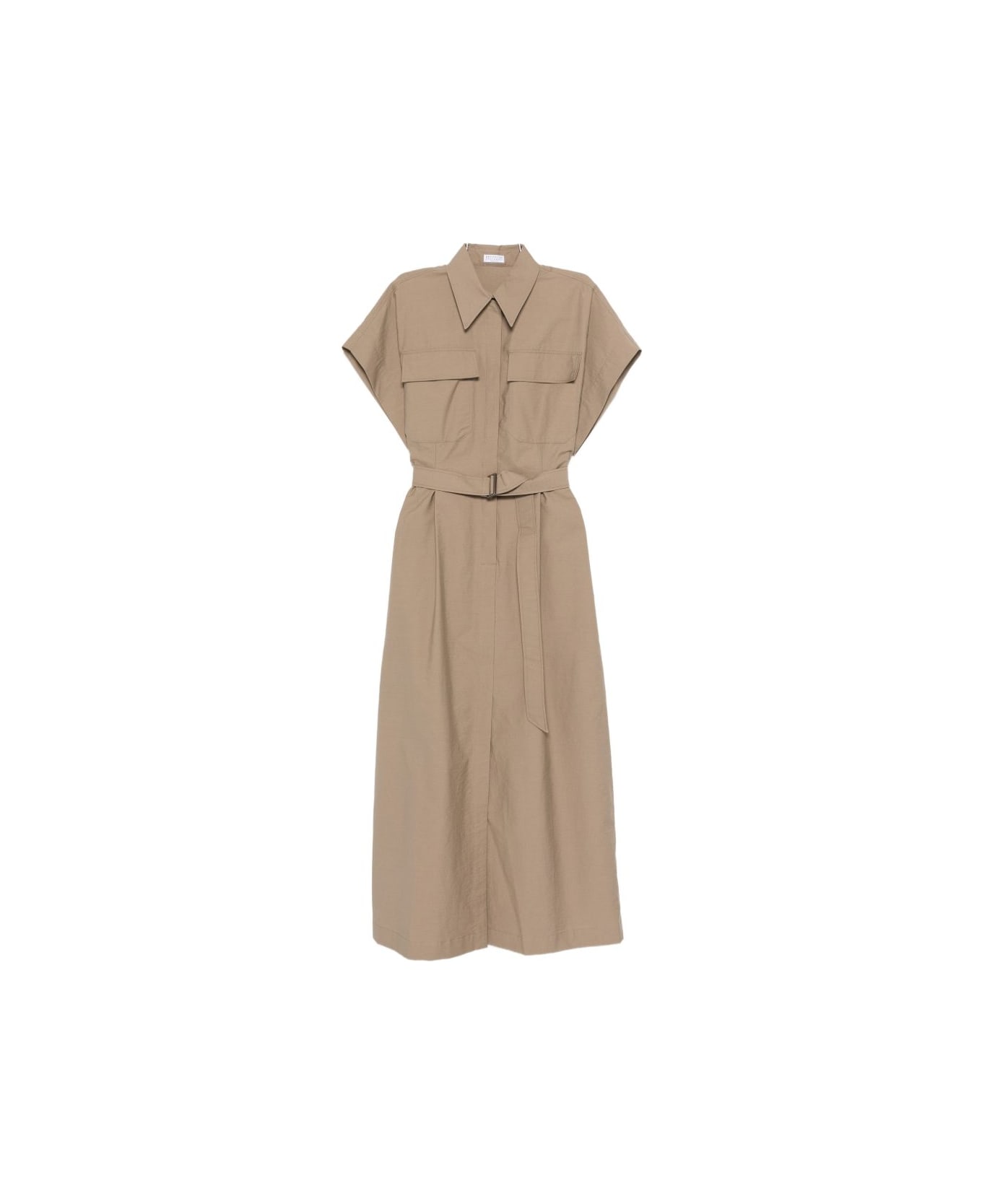 brown, chest patch pockets, pointed collar, short sleeves, front slit, belt. Composition: 86% Cotton, 14% Polyamide