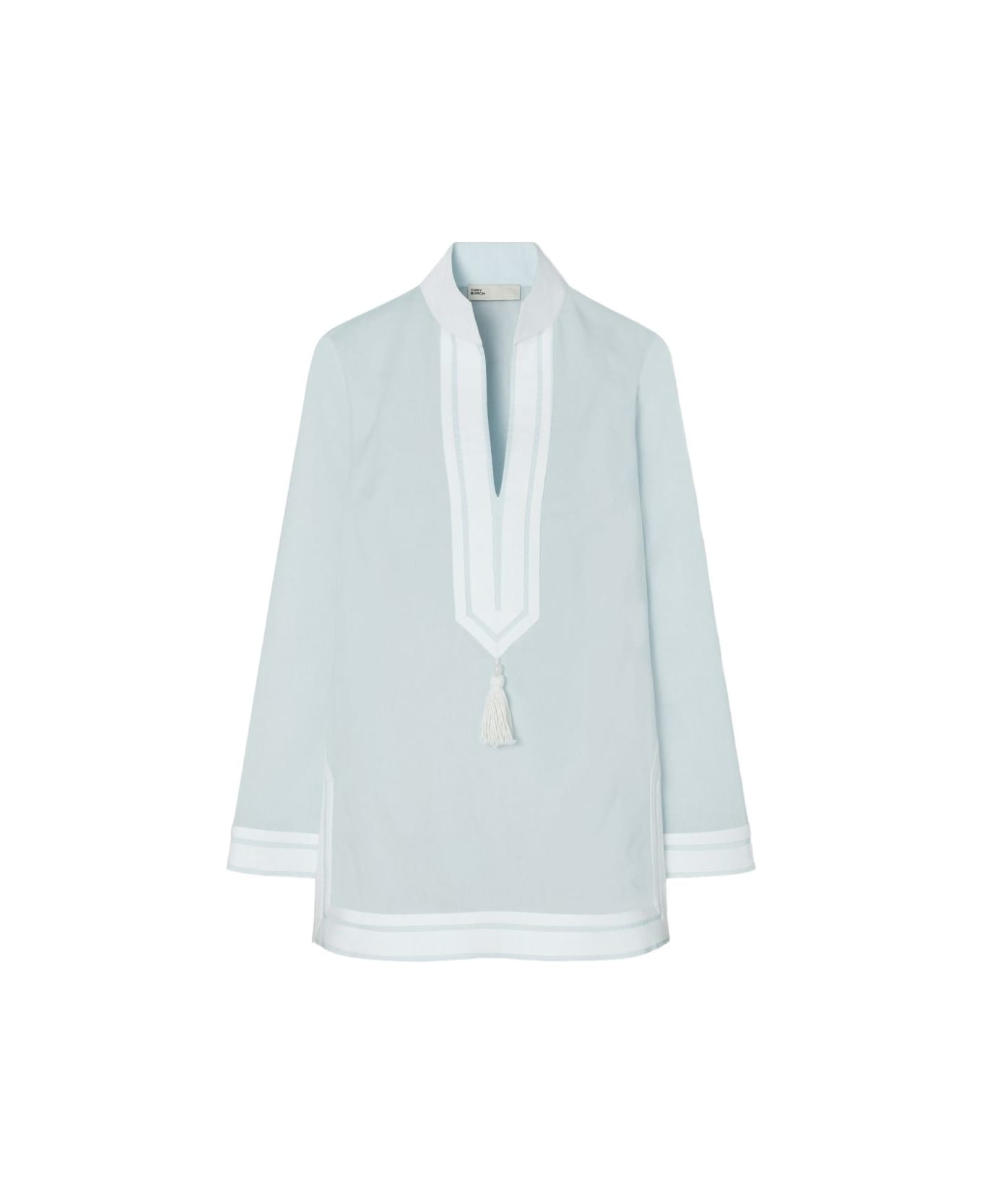 A brand signature. One of the first silhouettes we ever designed, inspired by Tory's travels. In lightweight cotton voile, the tassel tunic is trimmed with herringbone twill at the collar, cuffs and hem. Universally flattering in a relaxed cut, it's the epitome of understated glamour. iced blue V-neck tassel long sleeves