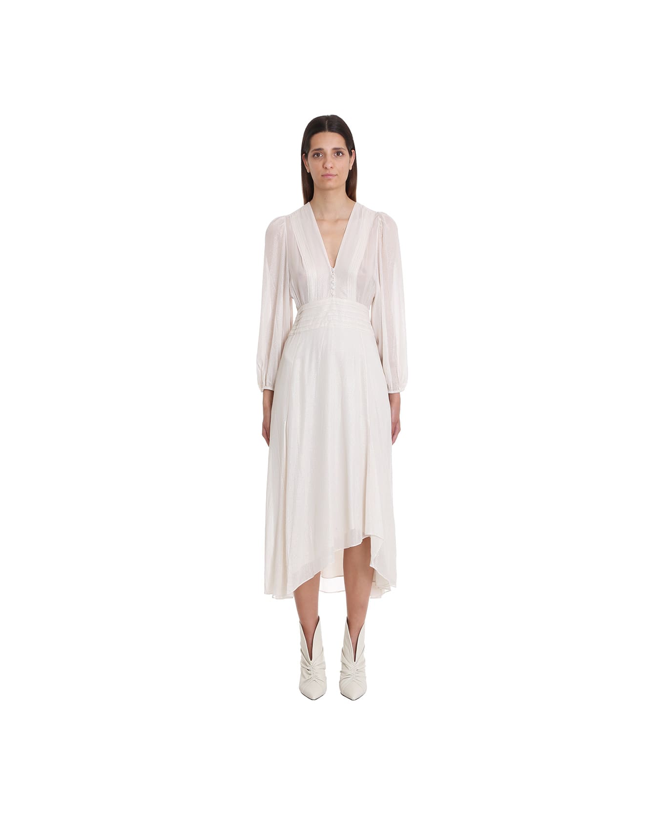 Joucque Dress in beige viscose, V neck, long sleeves, asymmetrical cut, zip clousure, embroidered on front, front buttons detail, Model is 180 cm and wears 38 Composition: Viscose