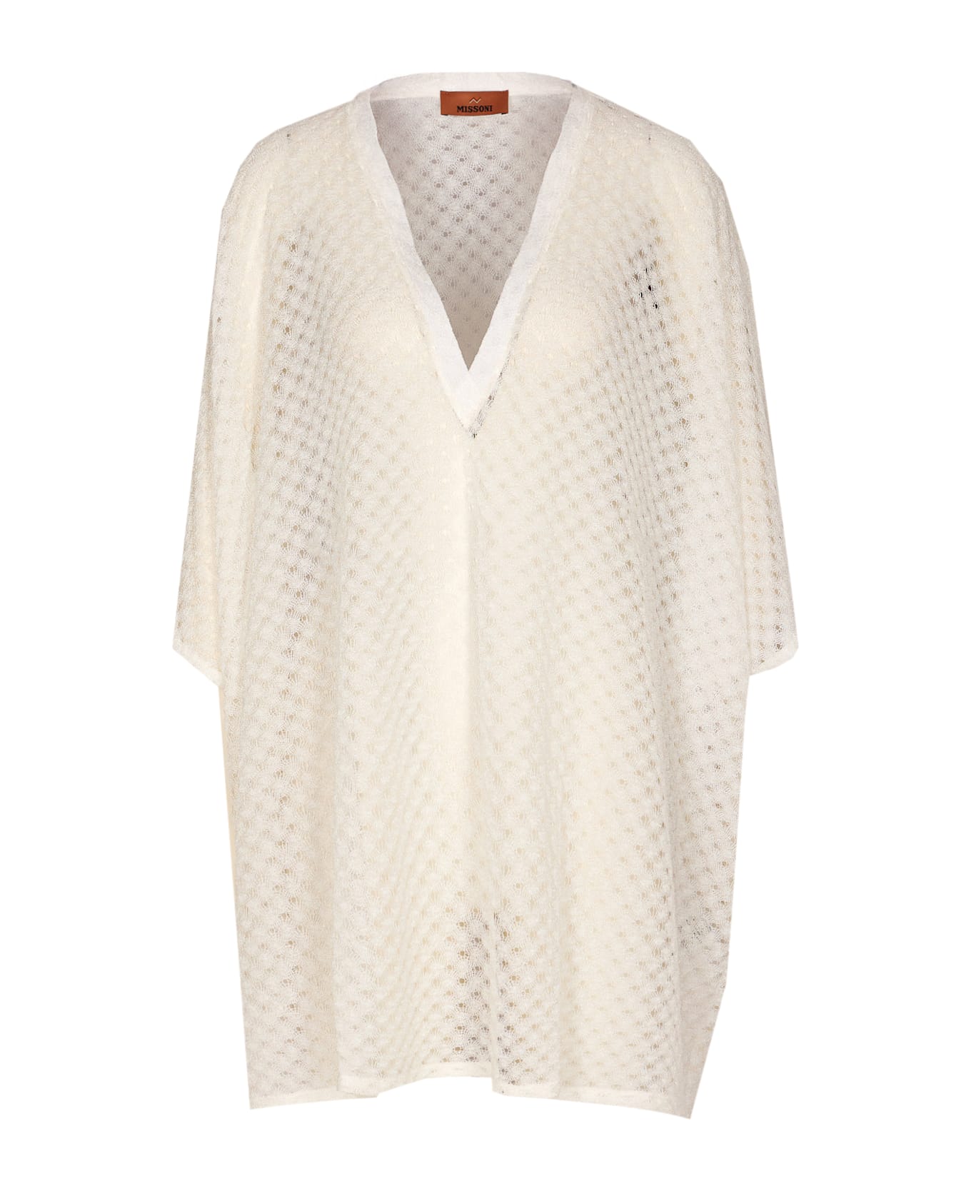 Missoni white short lame' Raschel workmanship caftan, V-neck, lurex, short sleeves