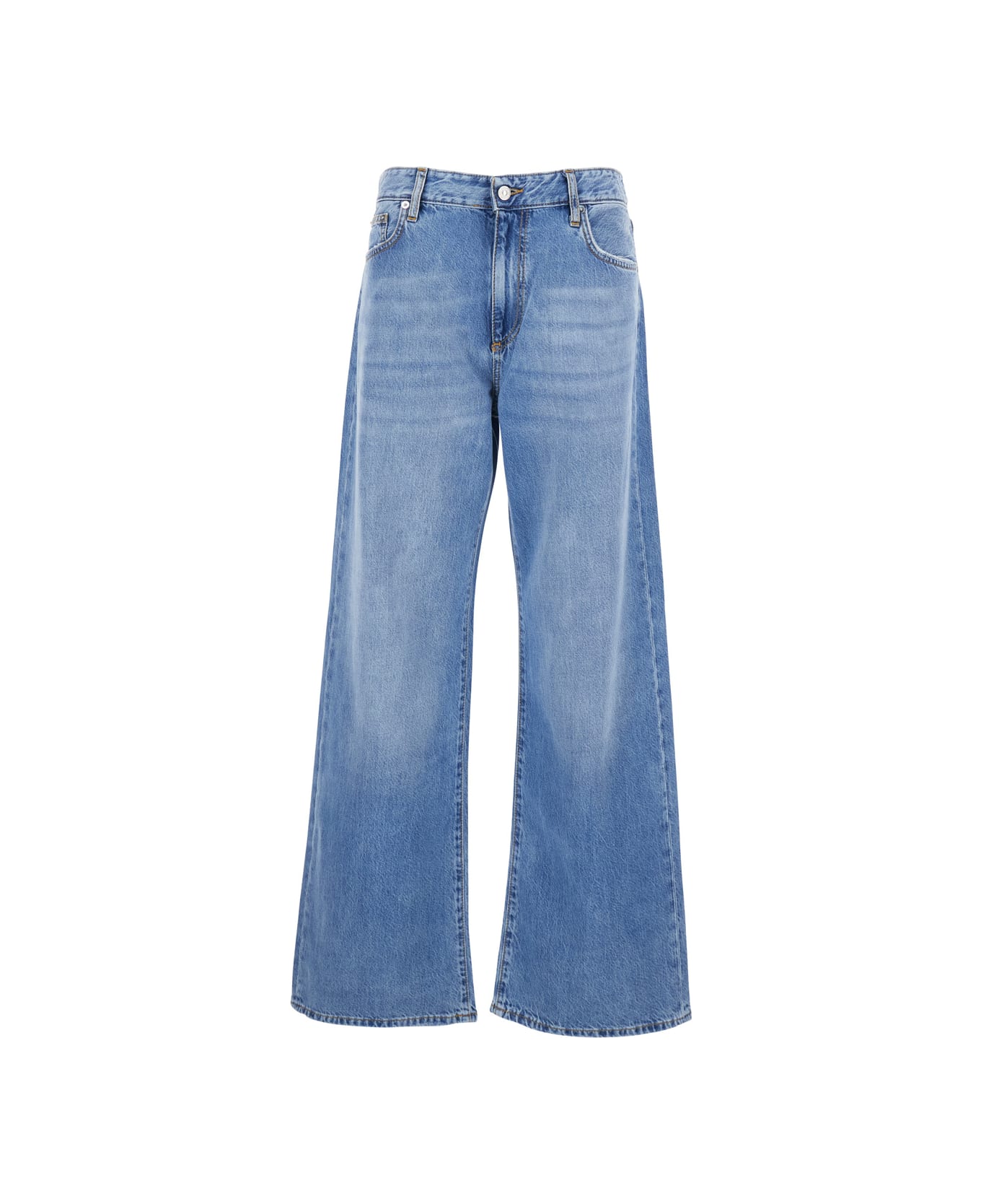Blue high-waisted jeans with five pockets. They feature a zip and button closure at the front. Design with contrasting stitching and straight hem. Made of denim. Regular fit.