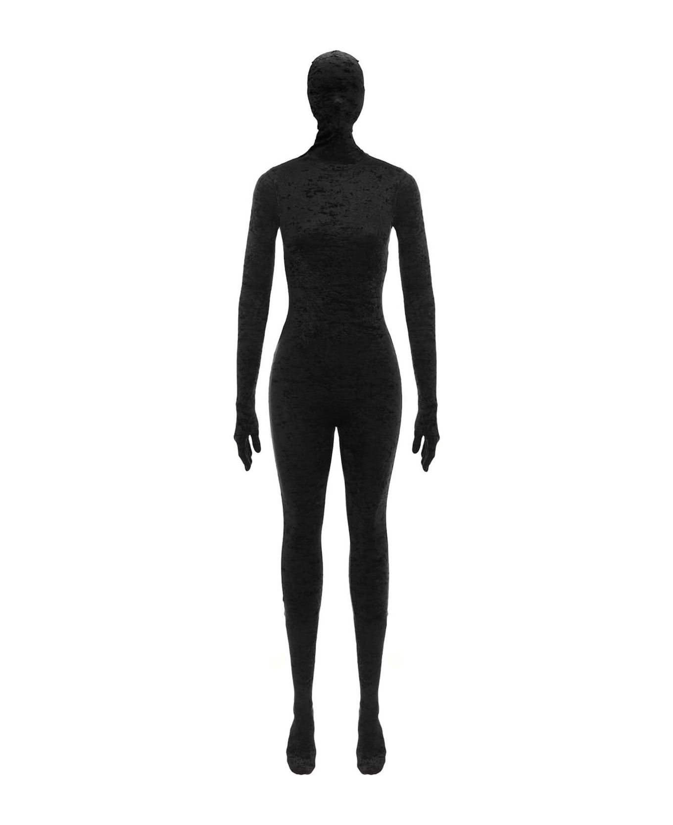 Entire velvet bodysuit including gloves, feet, a mask with a zip closure at the back and fit. 2022/2023 Fashion Show Fall Winter Composition: 85% polyamide 15% elastane