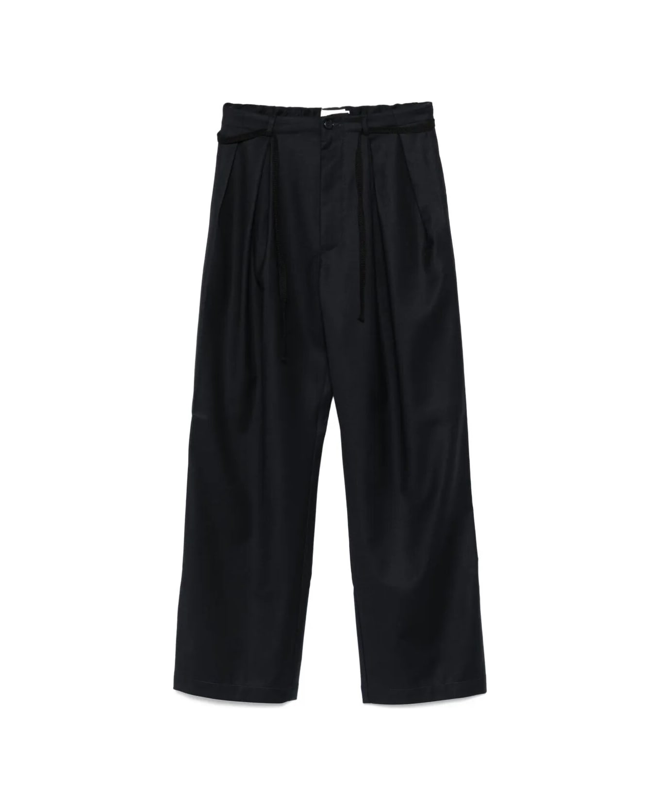 Tailored trousers in virgin wool in navy blue, featuring a high waist, front pleats, and side slit pockets. The straight cut and central crease provide a sleek and refined appearance. Perfect for completing a formal look or adding a touch of class to a casual outfit.
