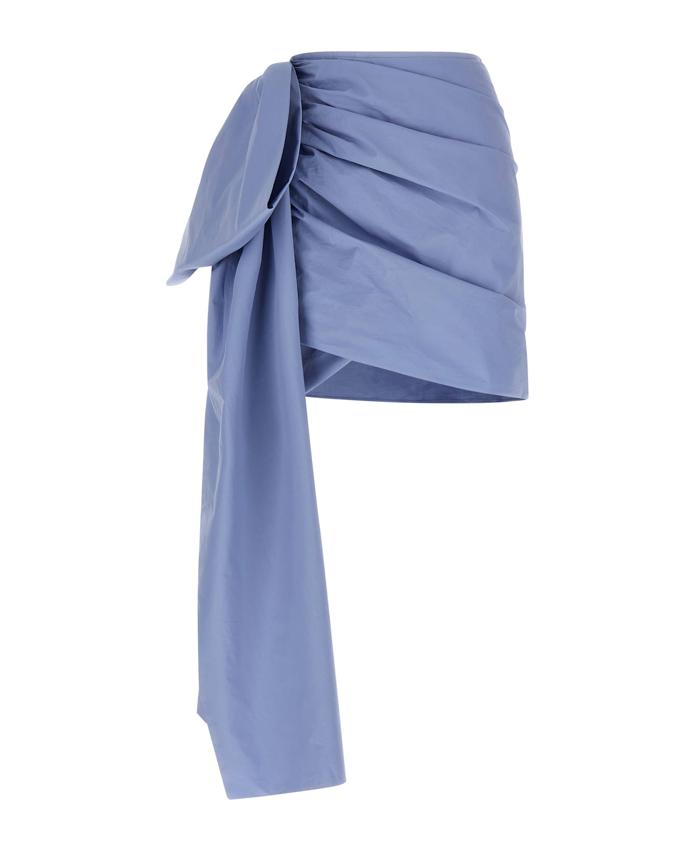 'Blue Cotton Tie Side Mini' cotton skirt with curled front and back, maxi bow detail, asymmetrical hem, side zip closure.