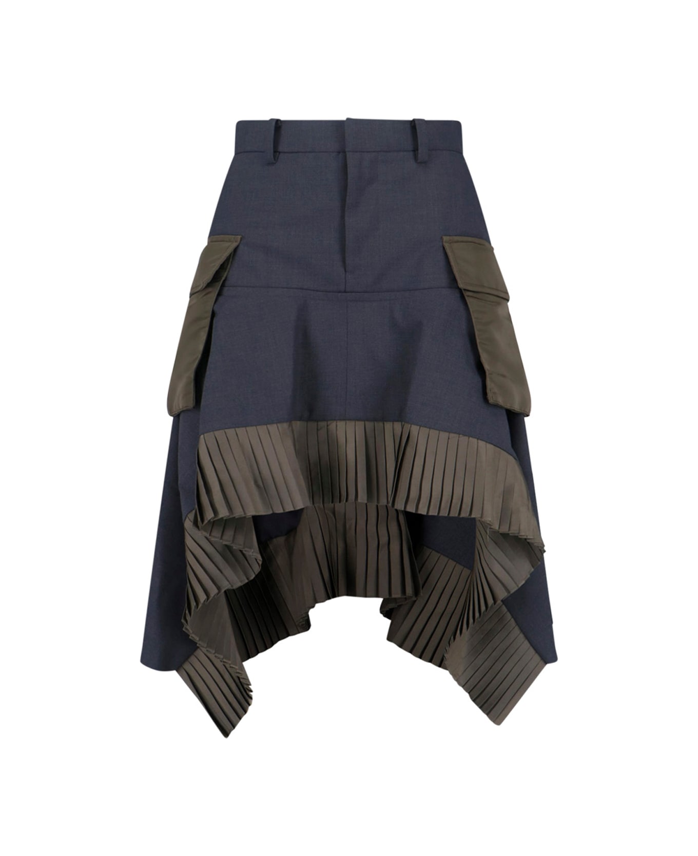 Sacai midi skirt in gray fabric with mid waist, zip and hook closure on the front, belt loops, two front flap cargo pockets, pleated details on the hem, asymmetrical hem.