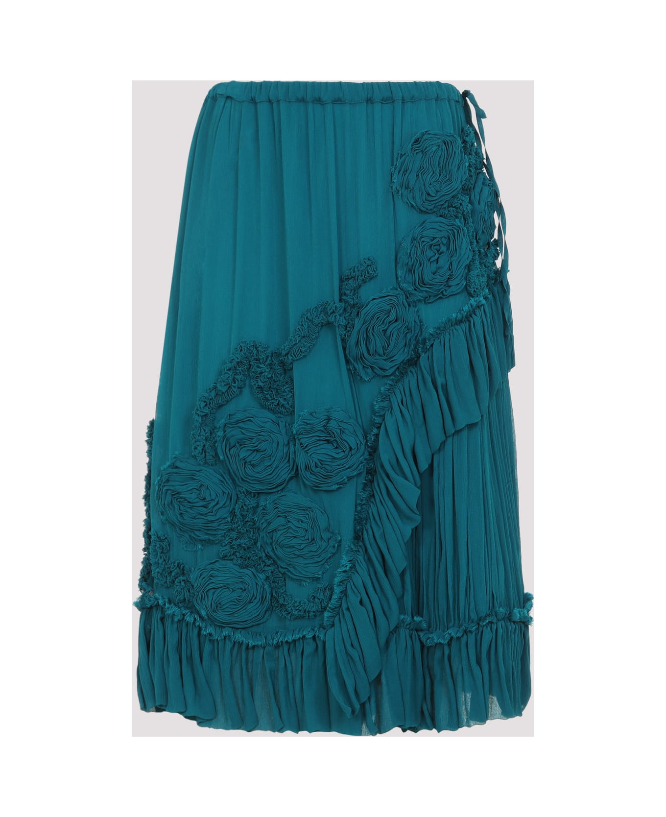 Dries Van Noten Sammy Bis Green Viscose Midi Skirt. Crafted from semi-sheer green viscose, featuring tonal floral appliqués, an elastic waist, a self-tie fastening on the side, and an asymmetric hem with ruffled trim detail.