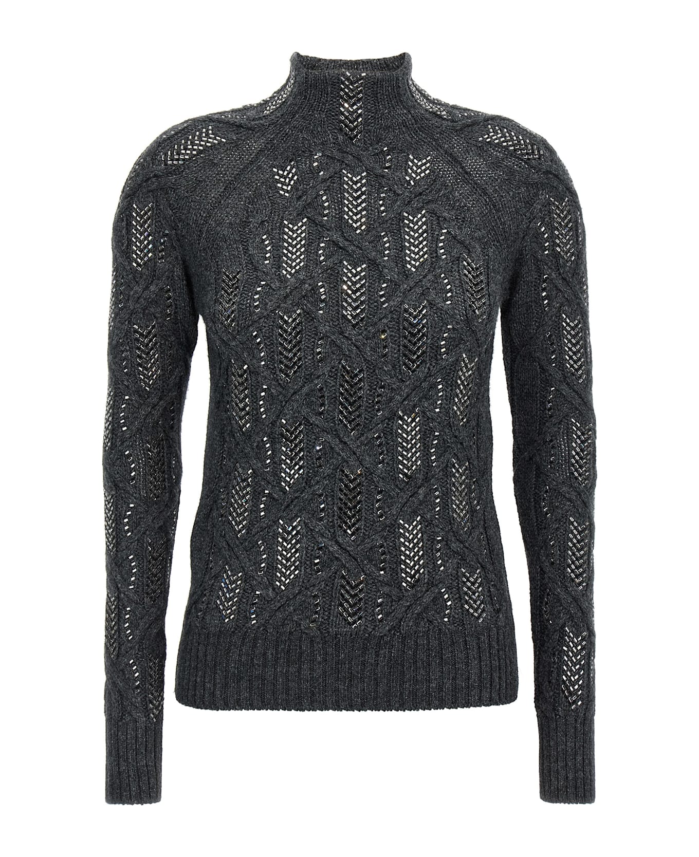 Virgin wool blend sweater with braided crystal appliqués, high neck, long cuffed sleeves.
