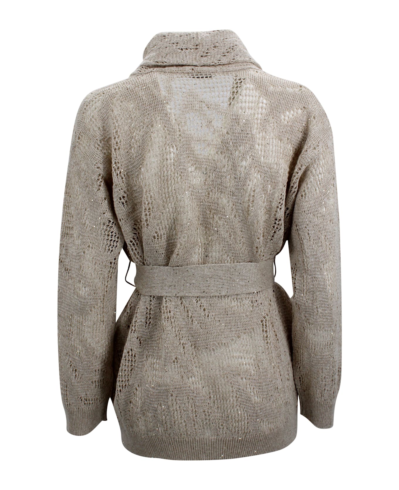 Cardigan crafted with an openwork knit, featuring a shawl neckline and a tie belt at the waist that defines the silhouette. The design includes long sleeves and is enhanced with sequin details for a subtle shimmering touch. Features Color: beige Openwork knit Shawl neckline Tie belt at the waist Long sleeves Sequin detail Origin: Italy Composition: 94% Linen, 6% Cotton