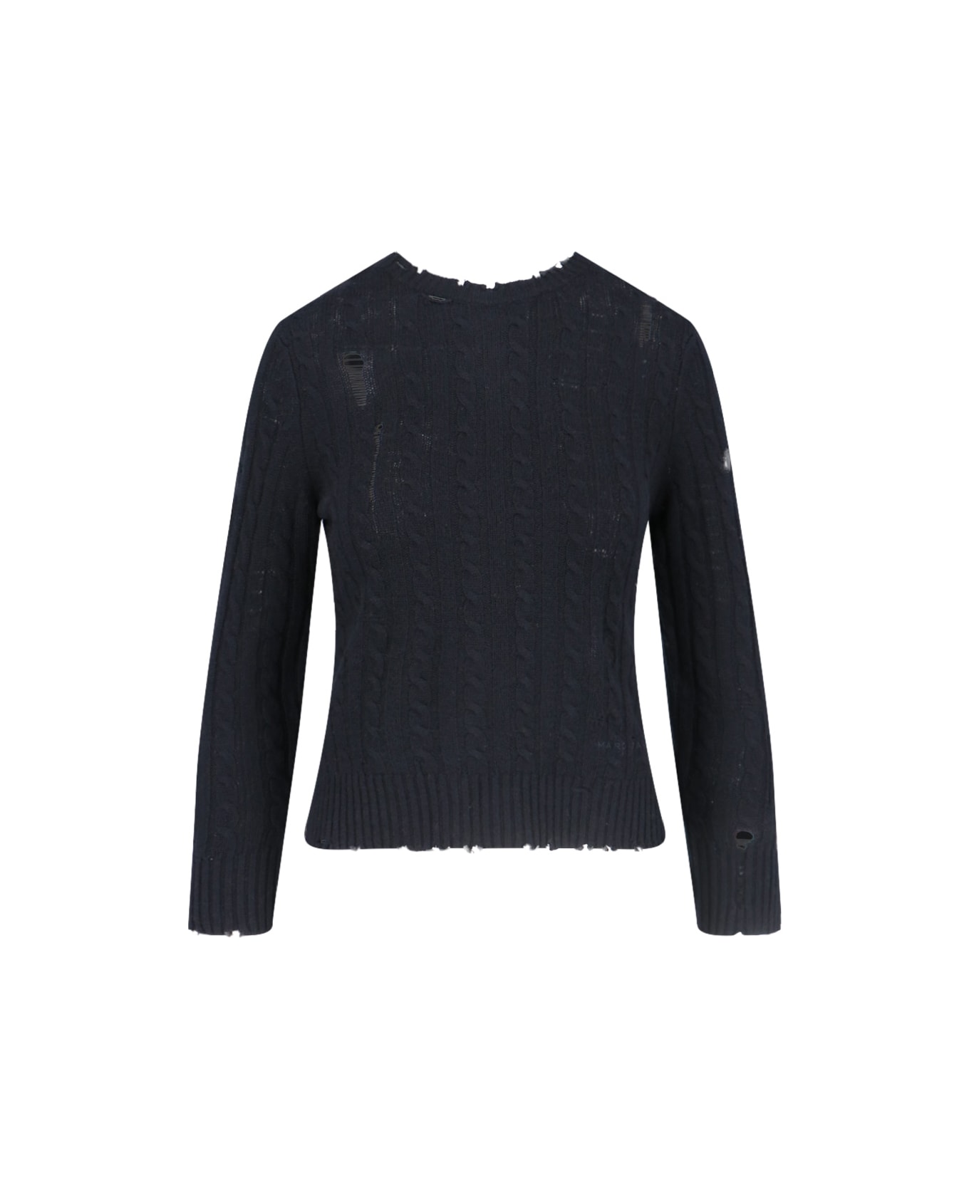 Marc Jacobs destroyed cardigan in black wool and chasmere with woven knit, front and back wearable design, all-over destroyed details, round neckline, button closure, silver rhinestone detail, ribbed trim, straight hem.