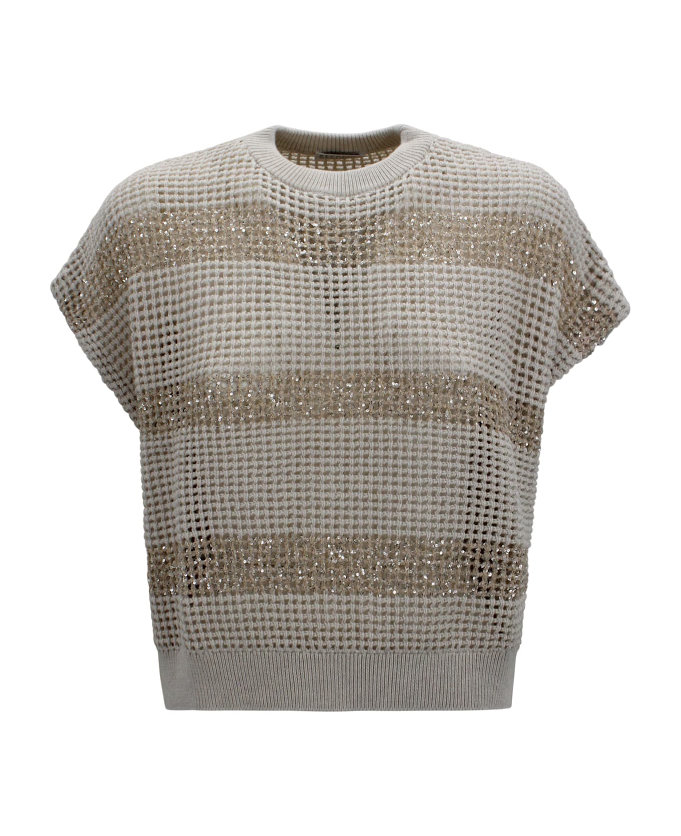 Knit top featuring an openwork knit design with a striped pattern and a crew neckline. The style includes short sleeves, offering a lightweight and versatile look. Features Color: white Openwork knit Striped pattern Crew neck Short sleeves Origin: Italy Composition: 100% Cotton