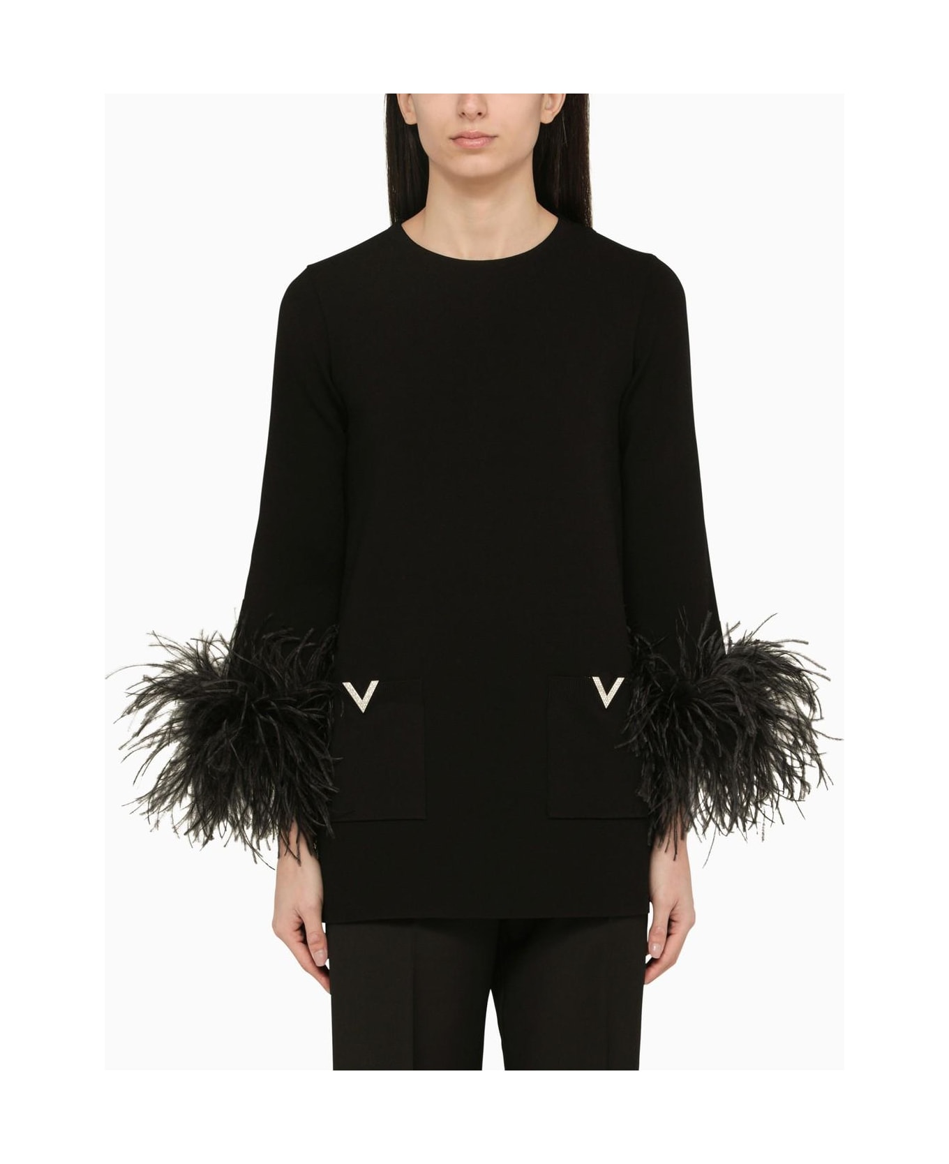 Black viscose crew-neck sweater by Valentino features feather embroidery on the cuffs, rear zip fastening and two front logo pockets. Composition: Fabric I: 83% Viscose - 17% Polyester / Ostrich feathers details