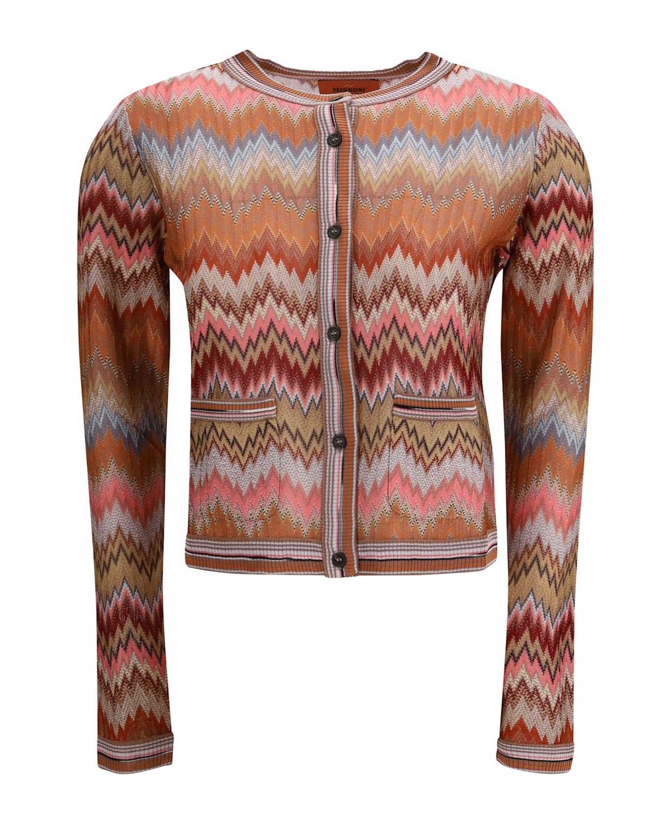 The viscose cardigan with snake chevron motif by missoni showcases the brand s signature textile artistry through an intricate raschel knit that adds depth and movement to the pattern. finished with front buttons and applied pockets, it balances functionality with refined elegance. a distinctive piece that enriches everyday and resort looks with texture and sophisticated visual appeal.