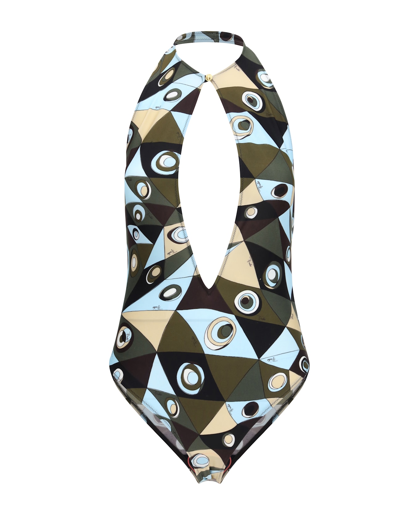 The occhi-print swimsuit by pucci stands out for its strong graphic impact, playing with bold openings and visual contrasts. the pucci swimsuit is crafted from stretch lycra and features a high neck that defines the upper part with a clean line. the central front opening introduces a sensual and contemporary element, while the deep open back is balanced by a metal button at the top of the neckline. the occhi print in khaki and blue tones enlivens the surface with vibrant energy. the pucci swimsuit completes the design with a distinctive and contemporary style. Composition: 80% % Polyamide, 20% % Elastane