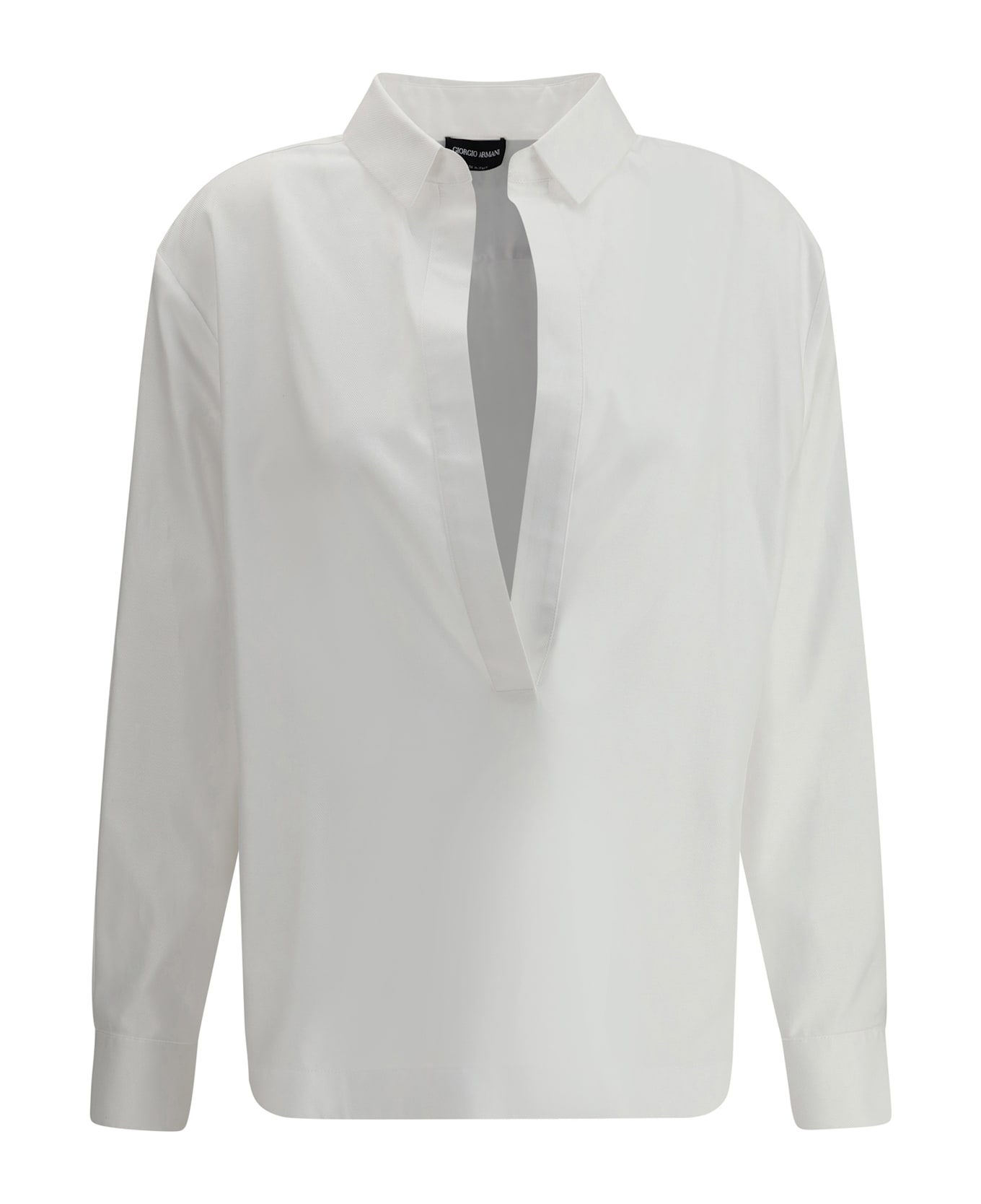 The giorgio armani v-neck shirt is an elegant and contemporary piece. featuring a classic collar, it has a deep v-neckline on the front that adds a touch of femininity. the two side slits and the asymmetric hem create a modern and dynamic design, perfect for a sophisticated but versatile look. this model reflects the class and innovation typical of the brand, ideal for casual-chic occasions.
