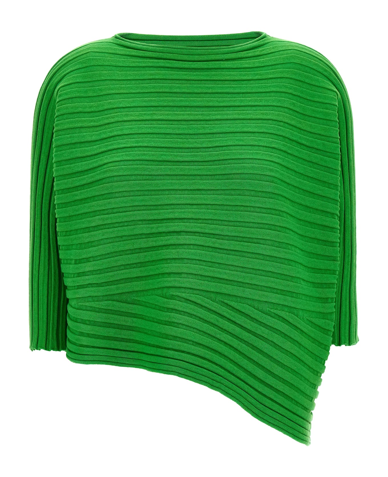 'Cotton Cashmere Knit' top made of cashmere knit using a mix of two knit structures with an irregular consistency, unique straight silhouette created by the combination of the two knit structures in the warp and weft, round neckline, 3/4 sleeves, asymmetrical hem.