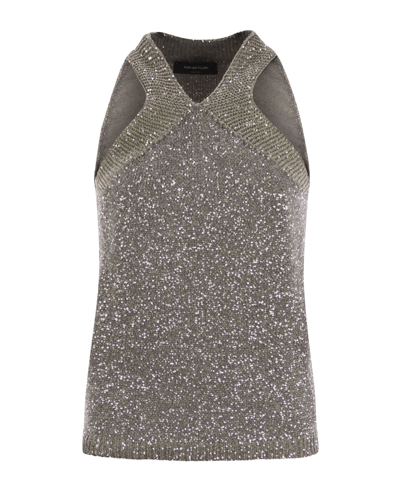 The slim line defines the timeless elegance of this brilliant high-neck tank top made of cotton webbing and embellished with sequins. Made entirely in Italy using sustainable processes. - Cotton webbing with sequins - High neckline DESIGNER ID: MAD275F552L331 8195 Composition: 53% Cotton, 26% Polyamide, 21% Polyester Lining: 100% Polyamide