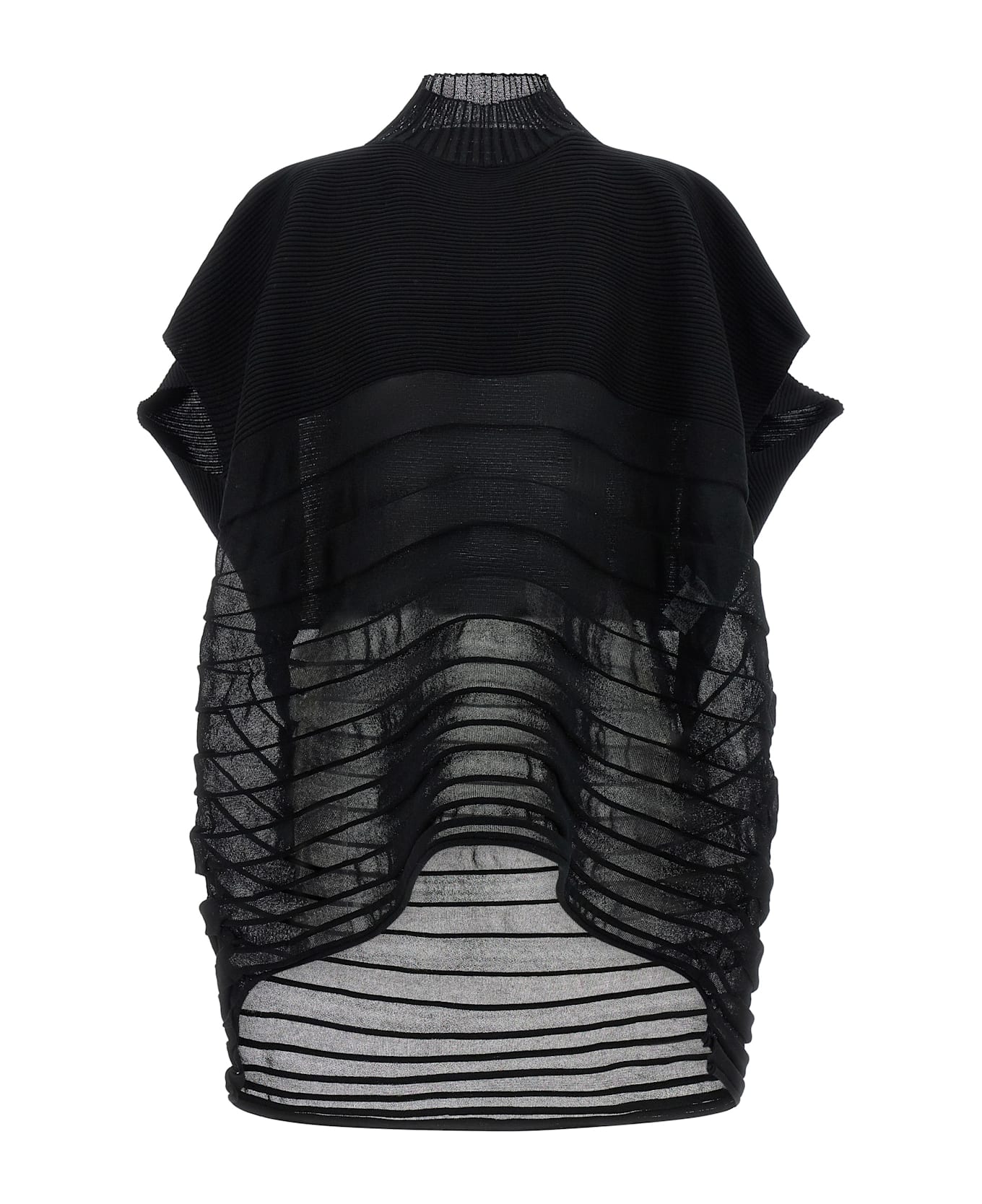 'Moving Knit' fabric top with contrasting knitted structures that create a light and elastic texture, high neck, short sleeves, asymmetrical hem.