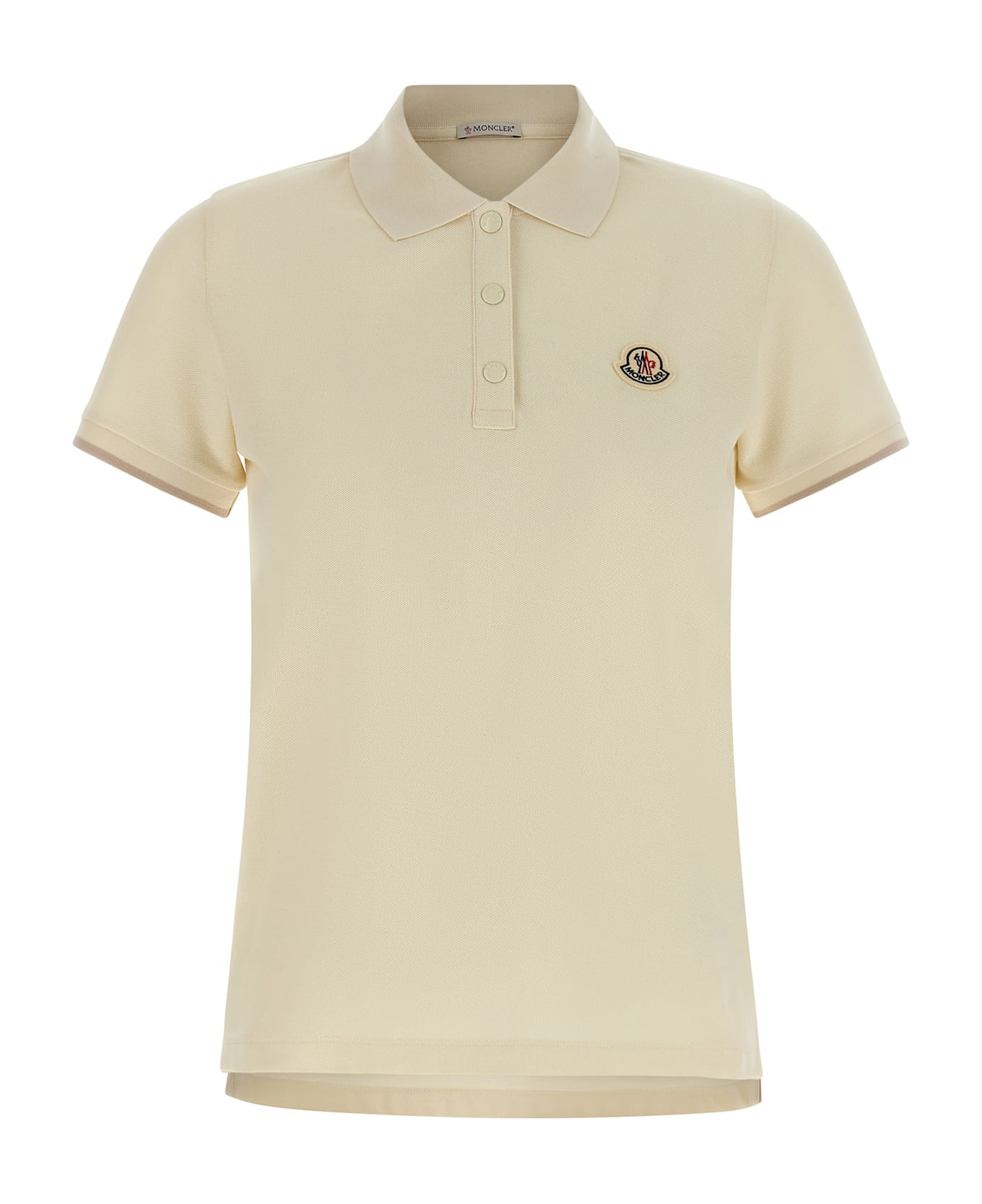 Cotton piquet polo shirt with contrasting details, front felt logo patch, snap buttons and collar, short cuffed sleeves, side slits, and asymmetrical hem.