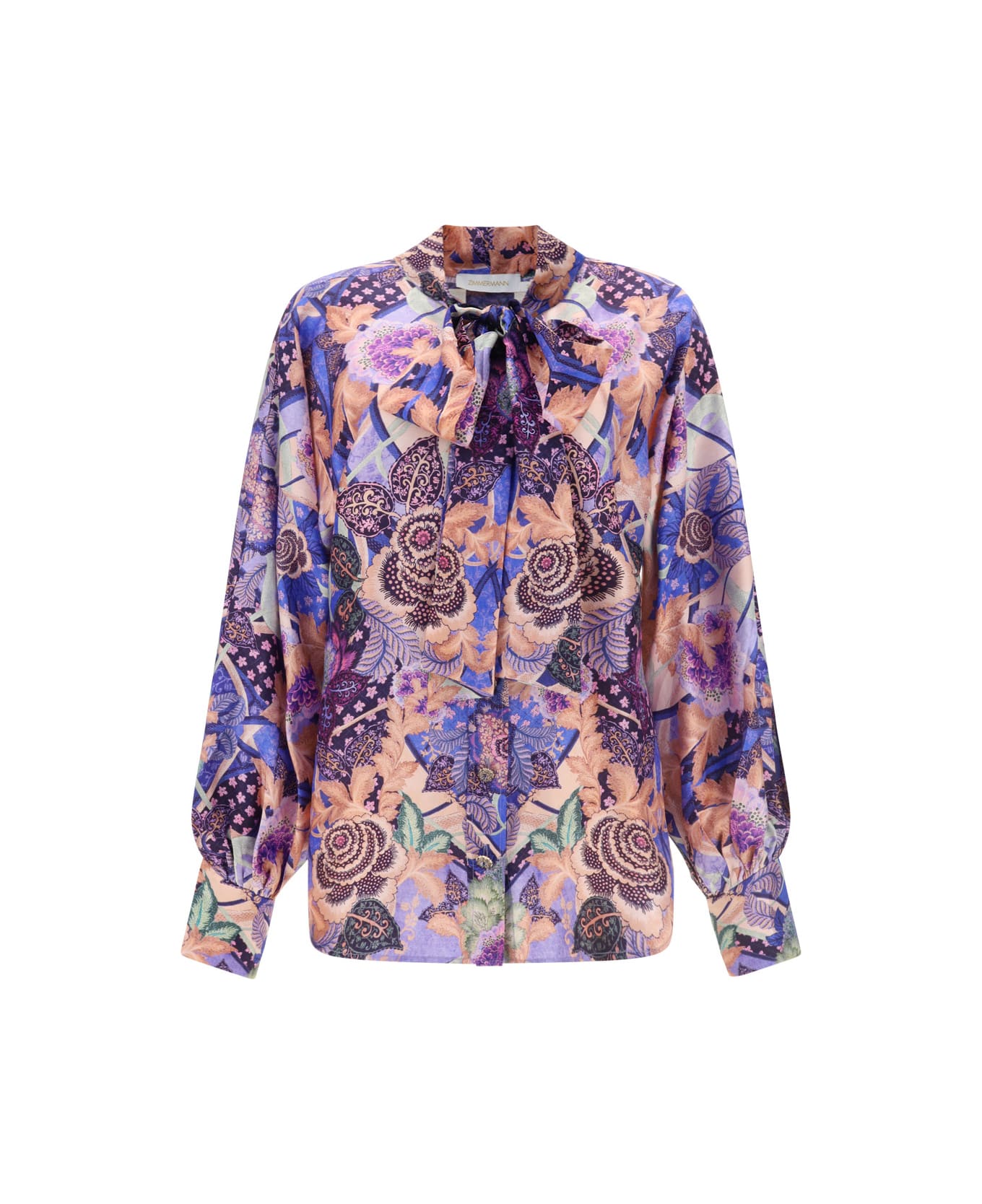 Celestial silk shirt by zimemrmann, collar with maxi bow applique on front, concealed front button closure, adjustable button cuffs, puff sleeves, all-over multicolored floral pattern, regular fit.