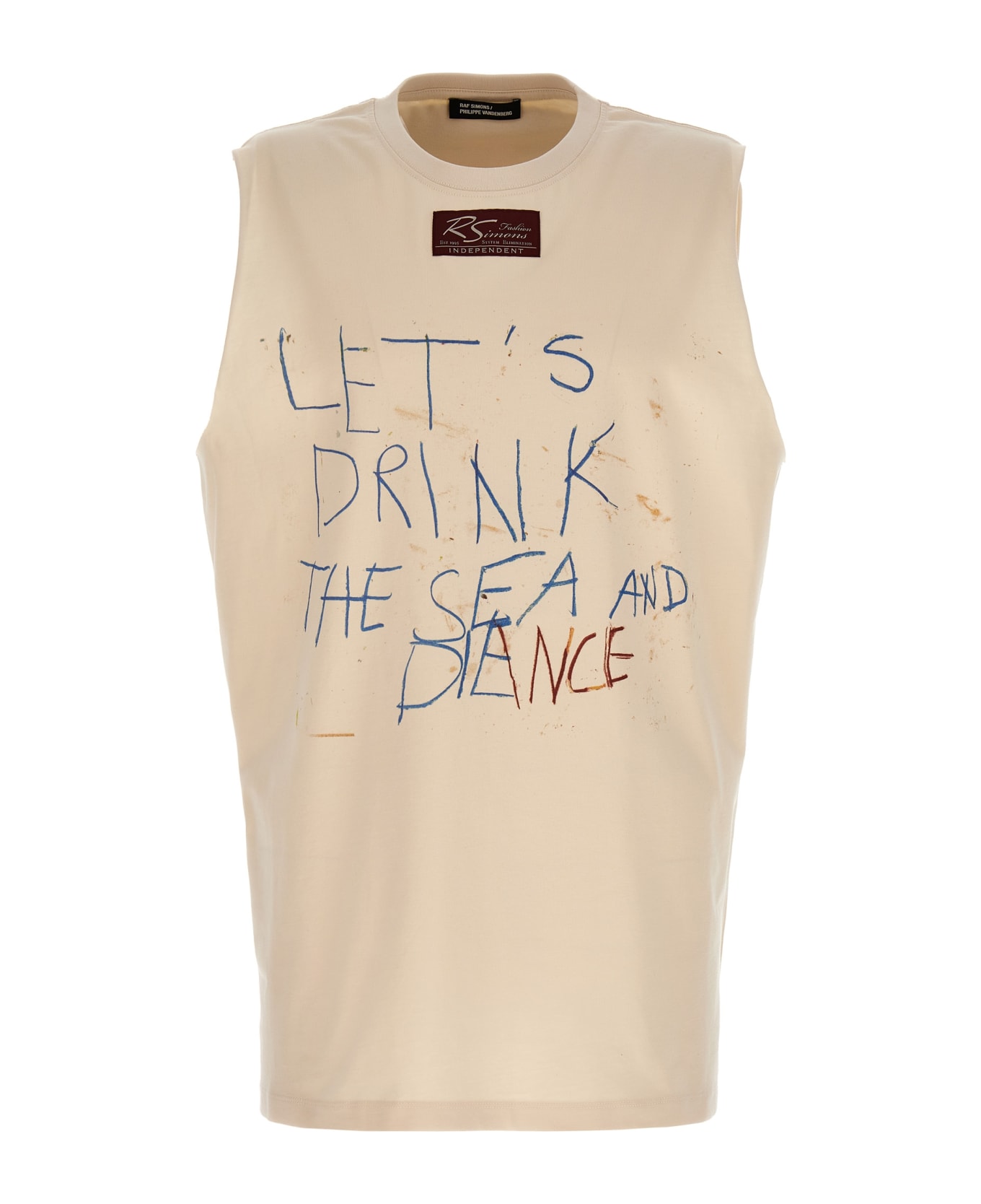 Cotton tank top with front 'Let's Drink The Sea' print, logo patch, crewneck, raw sleeve cut.