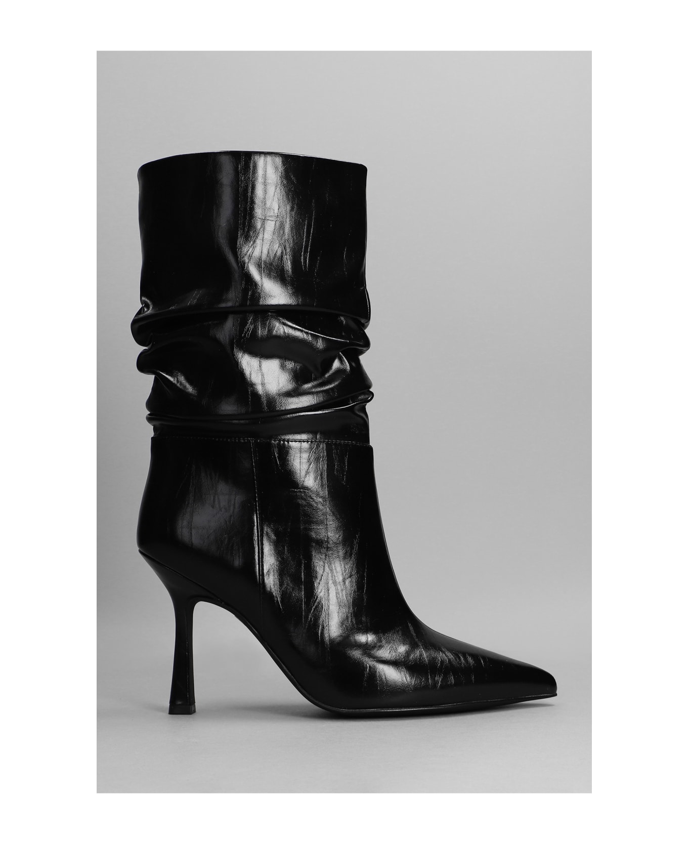 Guillo-2 High heels Ankle boots in black leather, pointed toe, draped, crocodile embossed leather, 100 mm heel, 100% leather, Made in China