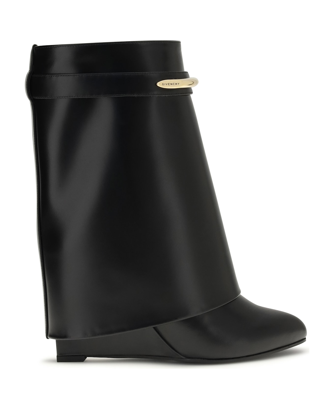 The leather shark ankle boots by givenchy are a bold mix of elegance and grit. with a distinctive shark silhouette, they feature a metal clip engraved with "givenchy" and gold-finish metal details that enhance the design. the pointed toe and covered wedge heel add a sophisticated touch, while the wraparound upper provides optimal support for the foot, ensuring comfort and stability. perfect for those looking for a bold, contemporary style.