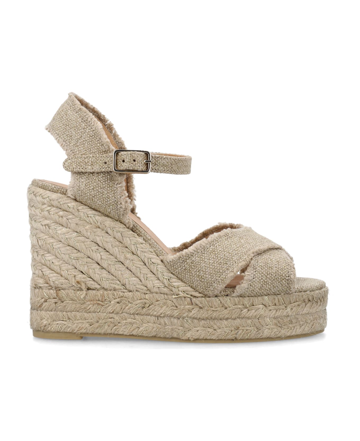 Cotton Bromelia 8 Espadrilles By Castañer. Featuring: Wedge Design Metallic Linen Glitter Effect Design With Crisscrossed Straps Frayed Finishing Ankle Straps Buckle Fastening Open And Rounded Toe Vulcanized Sole Of Jute Natural Colour Gold Lurex And Rubber Heel: 8cm Height Of 11cm, Wedge Of 8cm And Platform Of 3cm