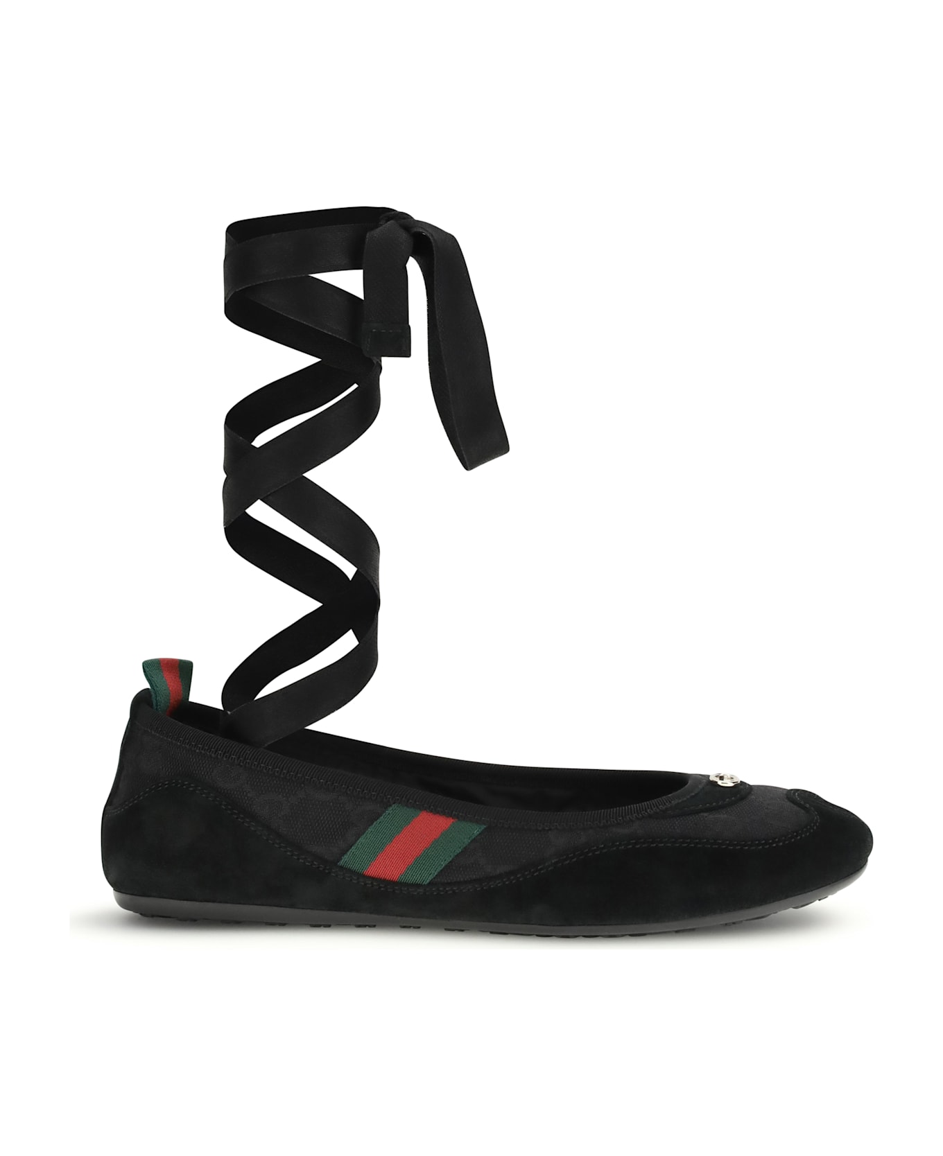 The shift ballerinas by gucci feature elegant black gg fabric with black suede trim. they have a web detail on the side and a ring on the back, which enrich the design. the toe is decorated with a metal gg cross, while the flexible rubber sole is embellished with the gg cross motif. removable satin laces allow you to customize the look, making this flat shoe ideal for any occasion.