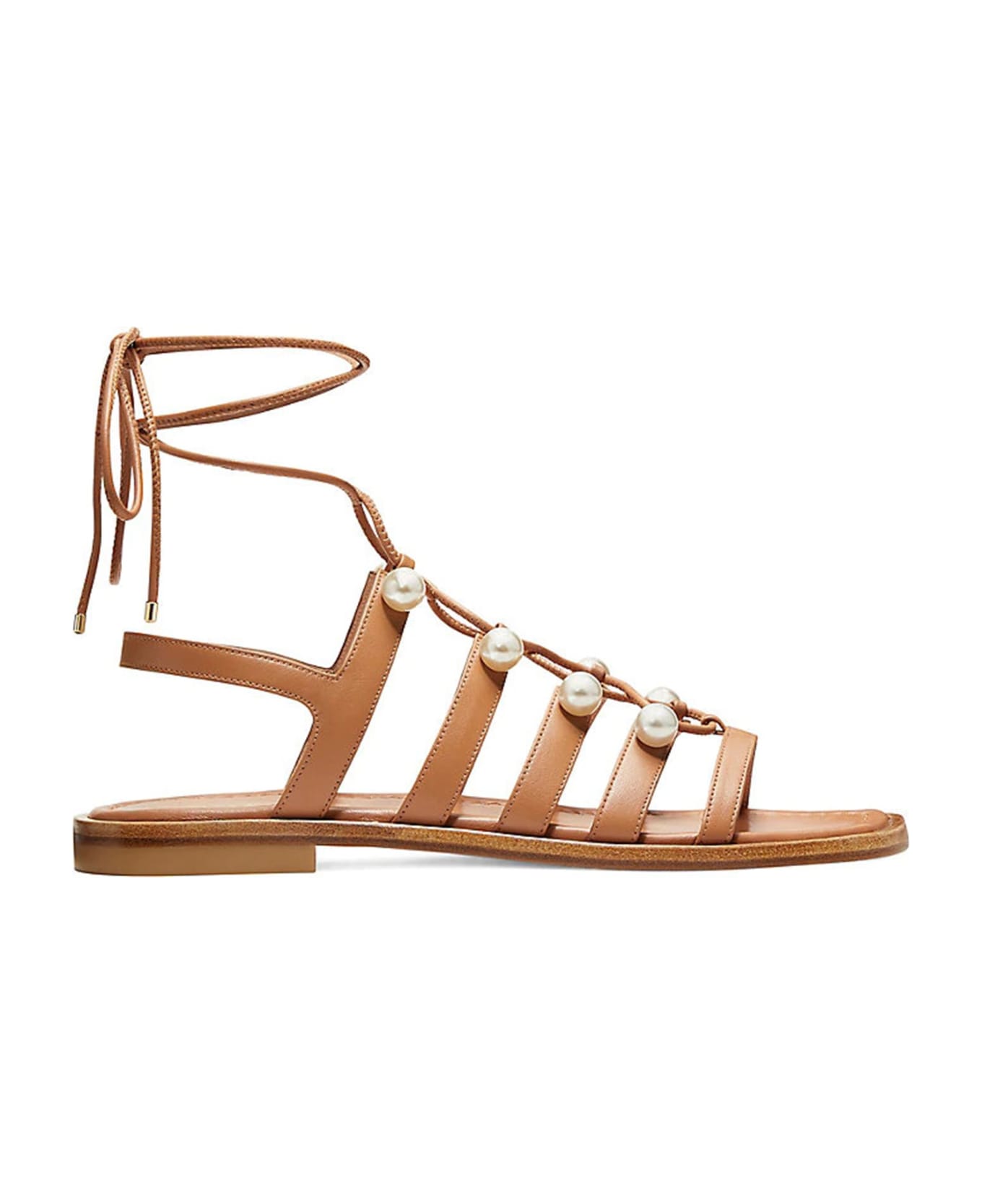 Stuart Weitzman S4569 Goldie Lace-lip Tan Leather Flat Sandals